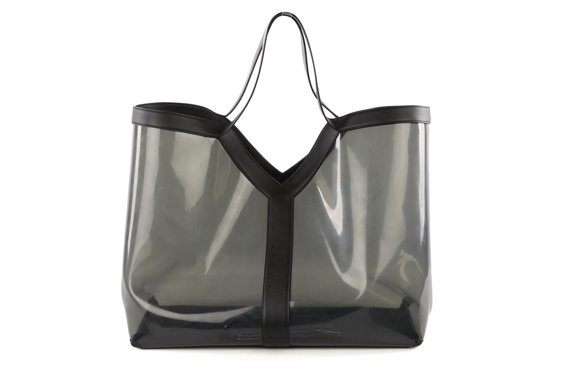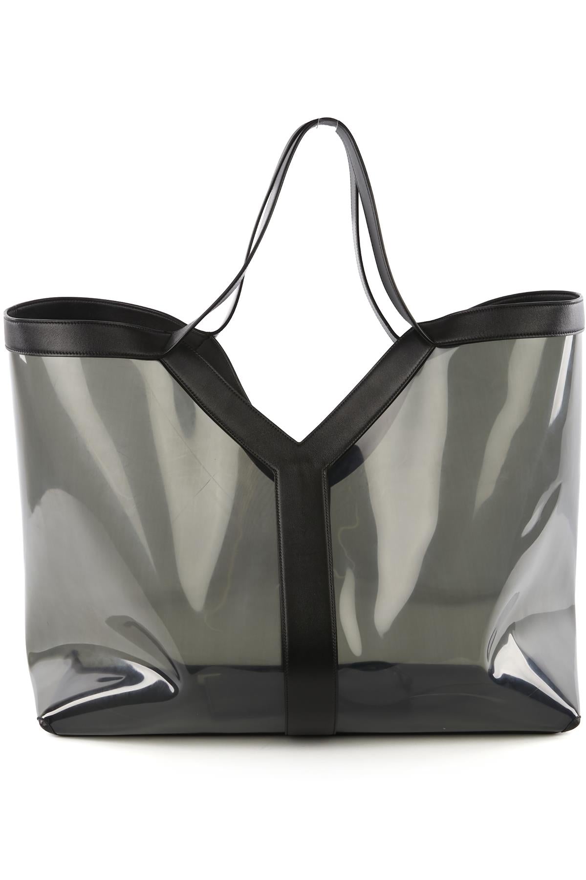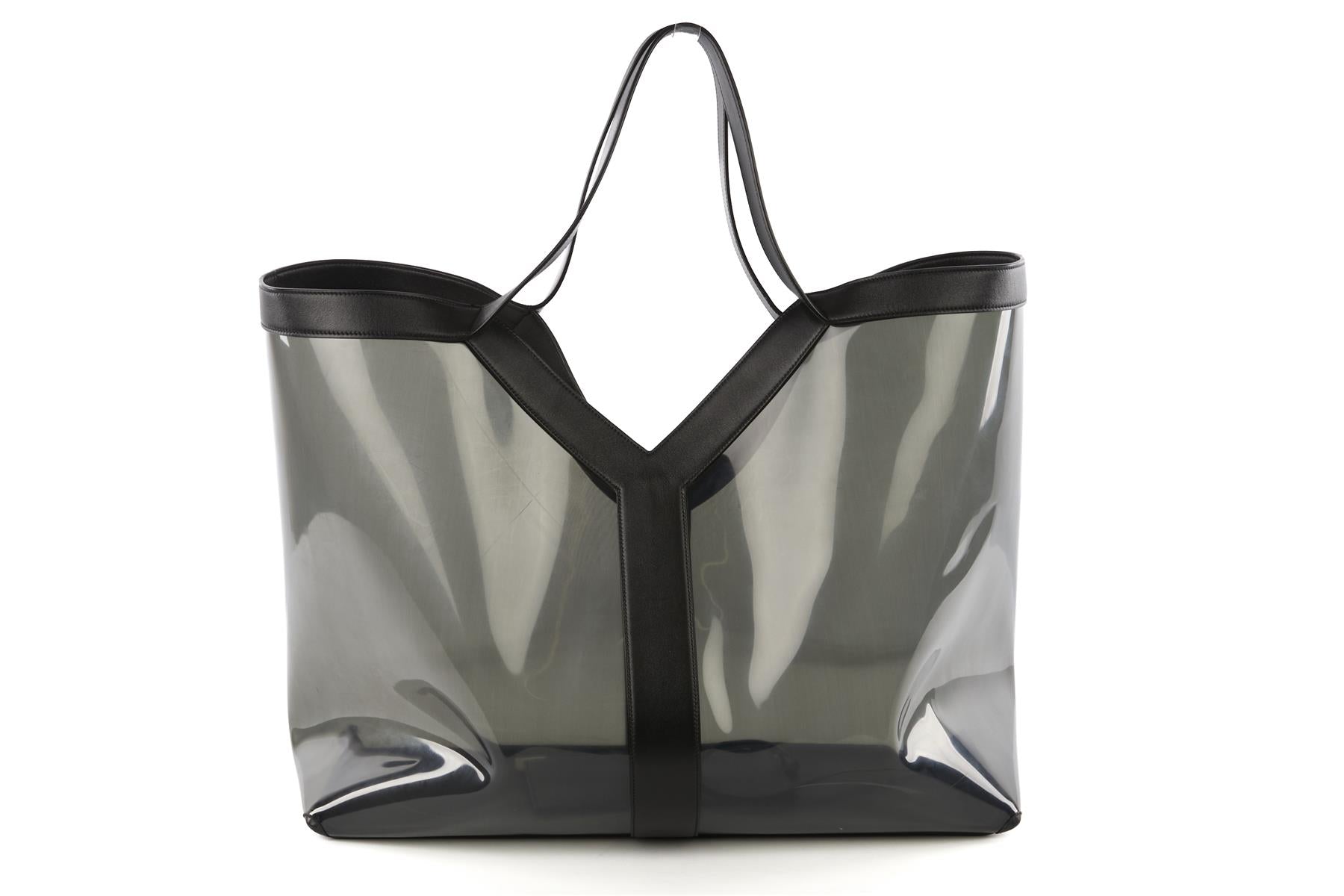 Saint Laurent Black Y Pvc And Leather Tote Bag. Black. Open Top. Comes with - dustbag. Height: 18 in. Width: 21 in. Depth: 8 in. Handle drop: 8 in.