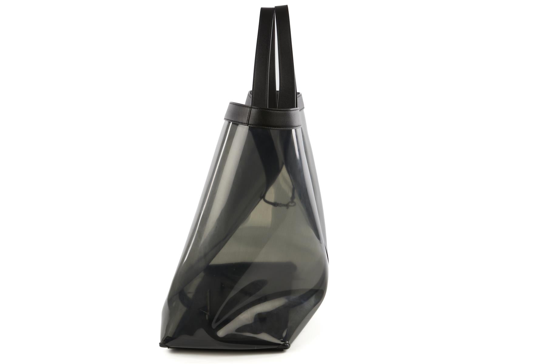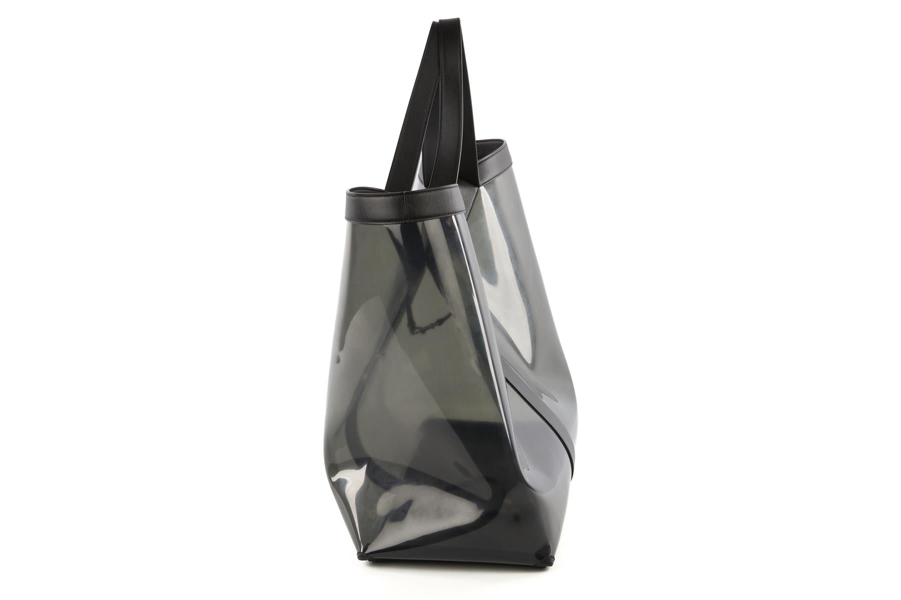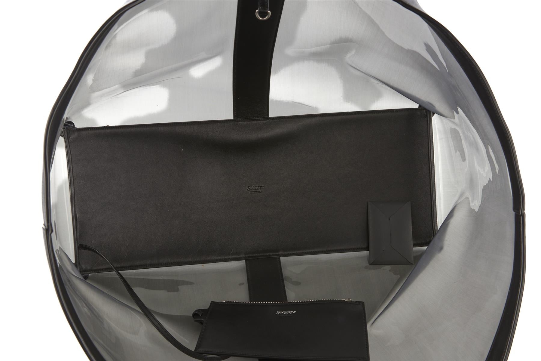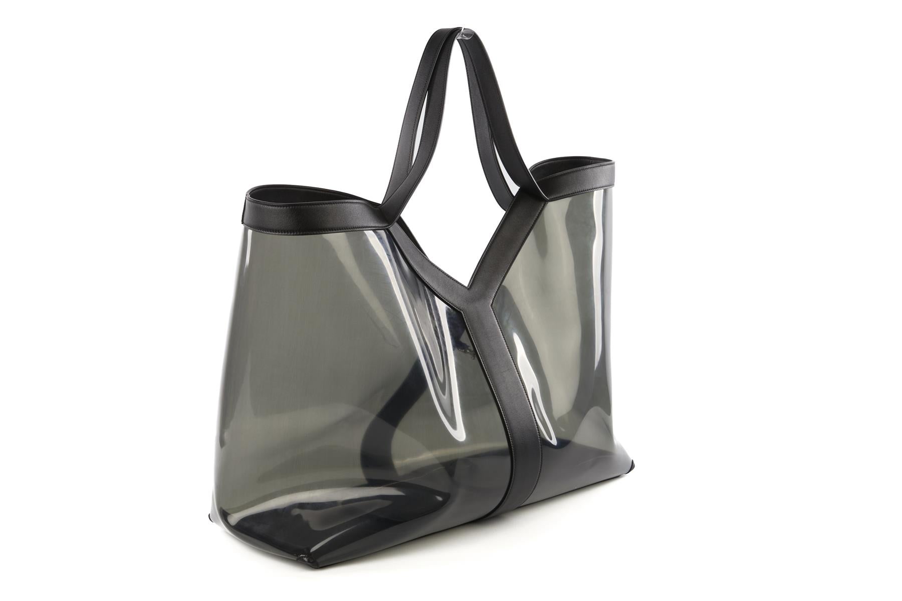 Saint Laurent Black Y Pvc And Leather Tote Bag. Black. Open Top. Comes with - dustbag. Height: 18 in. Width: 21 in. Depth: 8 in. Handle drop: 8 in.