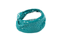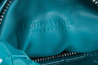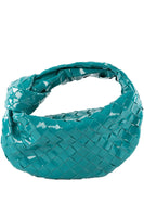 BOTTEGA VENETA BLUE JODIE MINI INTRECCIATO PATENT LEATHER TOTE BAG