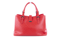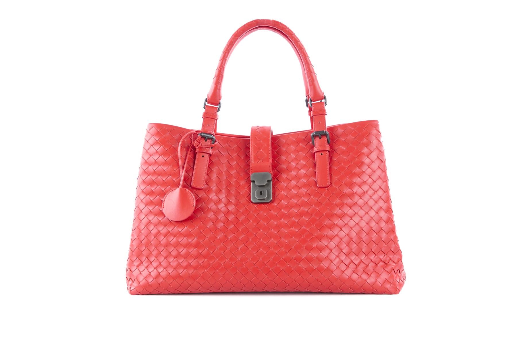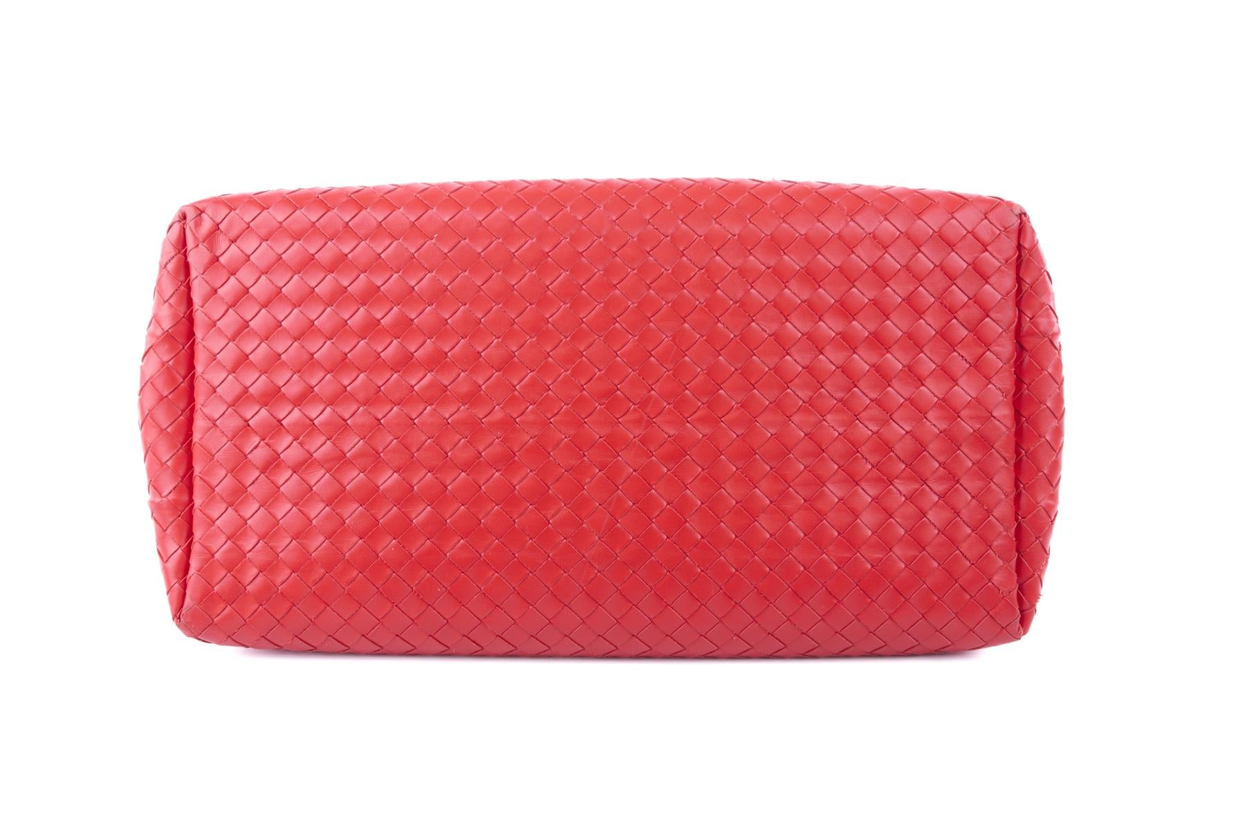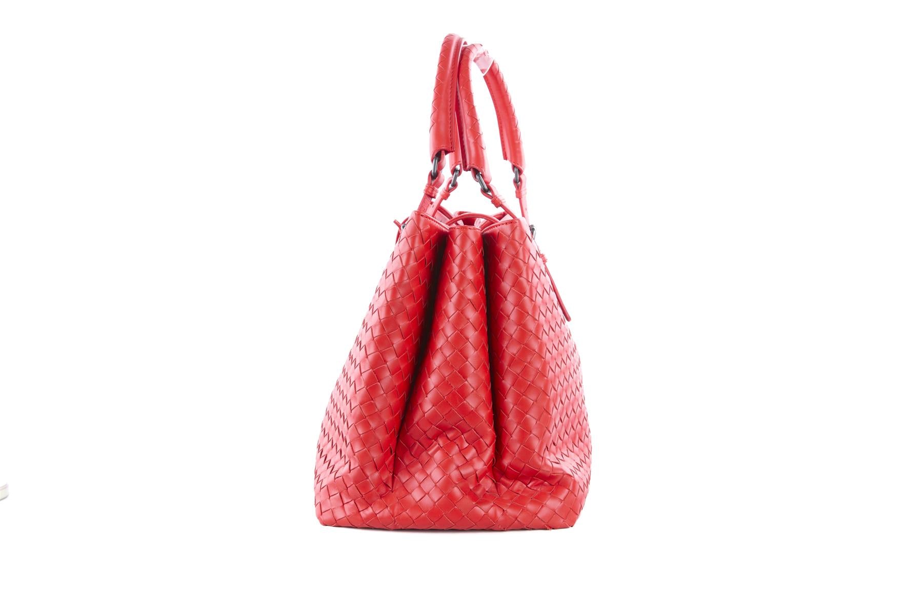 Bottega Veneta Red Roma Large Intrecciato Leather Tote Bag. Red. Push lock fastening - Front. Does not come with - dustbag or box. Roma. Height: 10 in. Width: 14.5 in. Depth: 8 in. Handle drop: 6 in.
