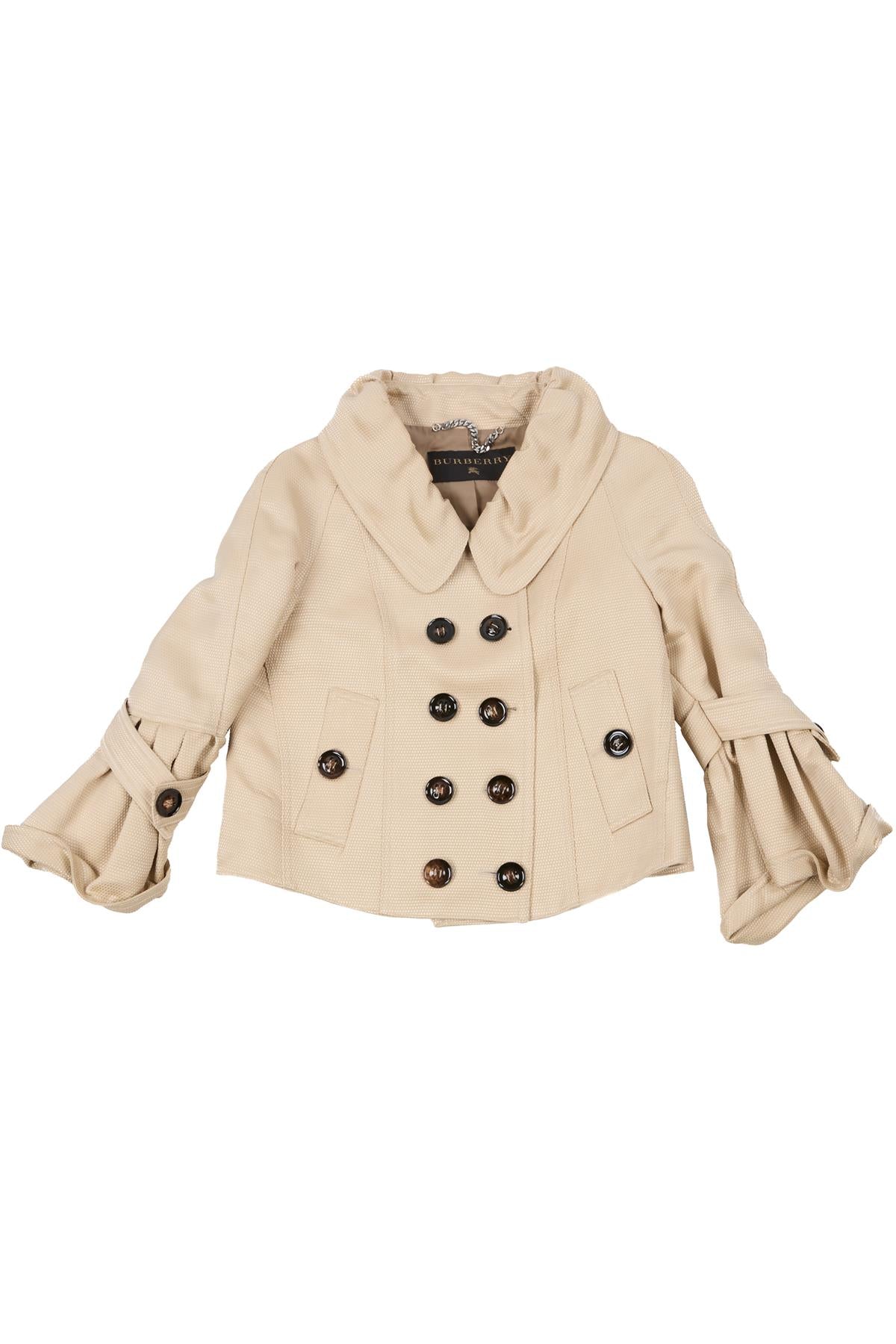 Burberry Beige Silk Jacket. Beige. 3/4 Sleeve. Crewneck. Button fastening - Front. 78% Viscose, 22% Silk. IT 38 (UK 6, US 2, FR 34). Shoulder to Shoulder: 17 in. Bust: 36 in. Waist: 35 in. Hips: 32 in. Length: 17 in.