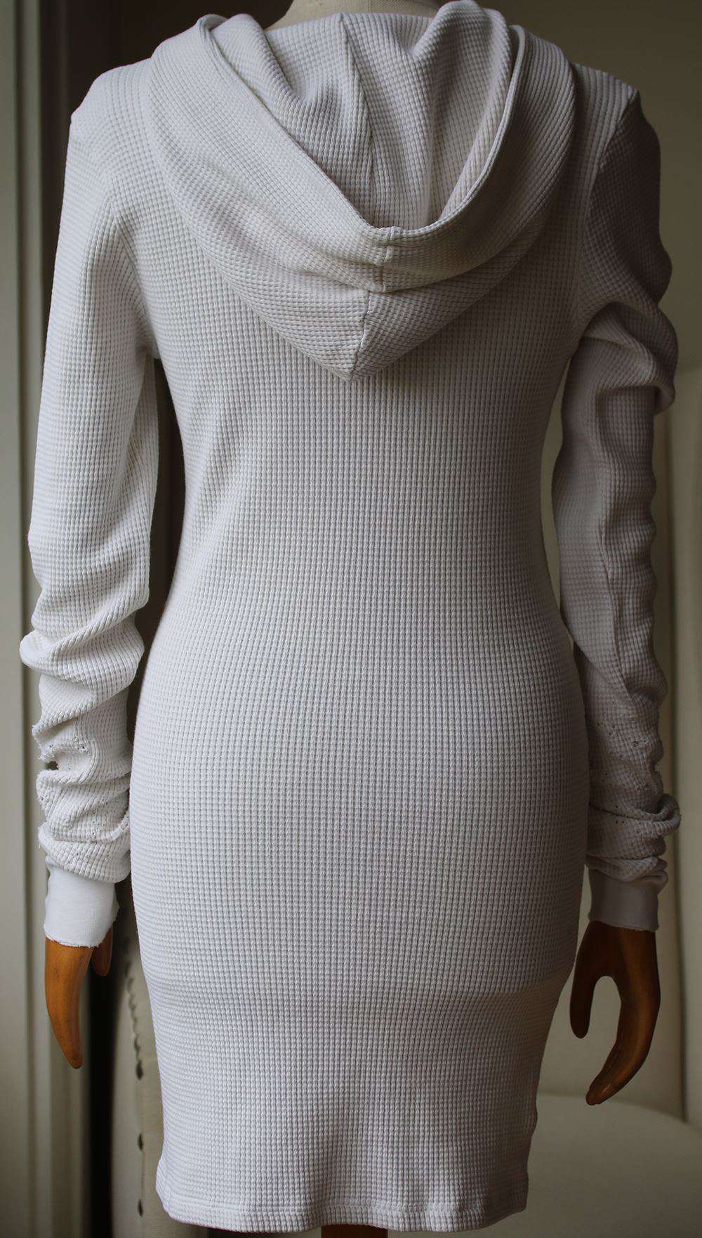 The Monaco Hoodie Mini Dress is a slimming new silhouette cut from a novelty Military Thermal. This piece is grinded and distressed by hand throughout the body for a unique contemporary look. Colour: Bone.