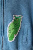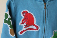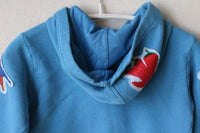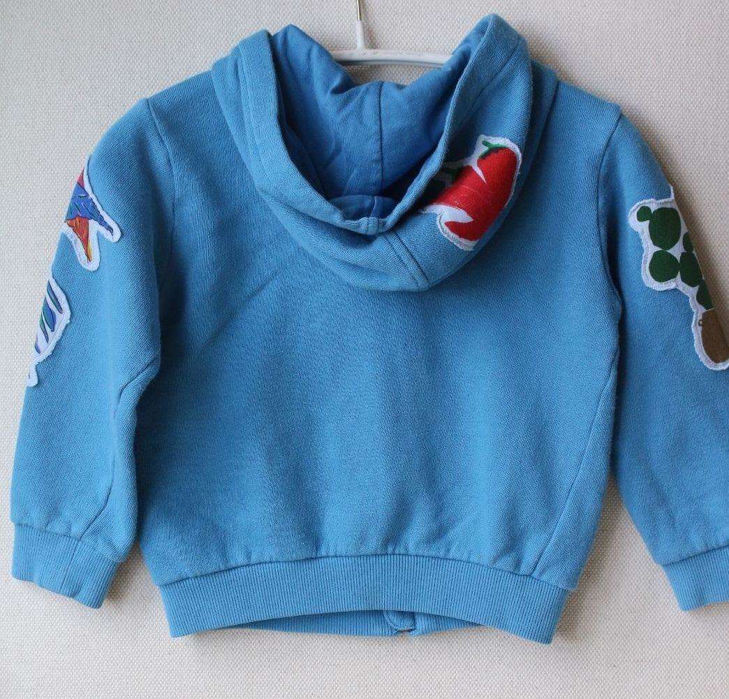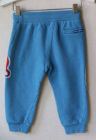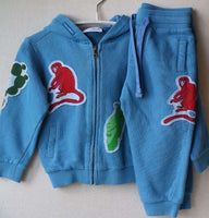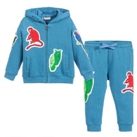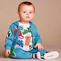 Dolce and Gabbana tracksuit . Baby boys blue hooded tracksuit by Dolce and Gabbana. Made in mid-weight sweatshirt jersey, in teal blue cotton with ribbed cuffs and hem. The top is hooded and zip-up with patchwork appliqué motifs of birds, animals and ceramics, native to the island of Sicily. The matching trousers have a drawstring elasticated waistband, appliqué patches, side pockets and ribbed ankle cuffs.