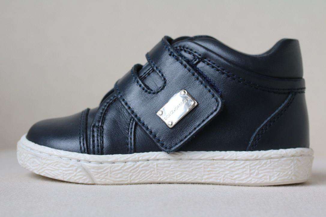 Dolce and Gabbana Shoes . Navy leather high-top shoes from Dolce and Gabbana. Soft and supple, they have a padded ankle and velcro strap fastening, with a logo embossed silver plate at the side. They have a padded tongue and leather inner sole, with a non-slip rubber trainer style sole. and Size - EU 21, UK 4.5, US 5.6 RRP: £175 Ref: SBSH1