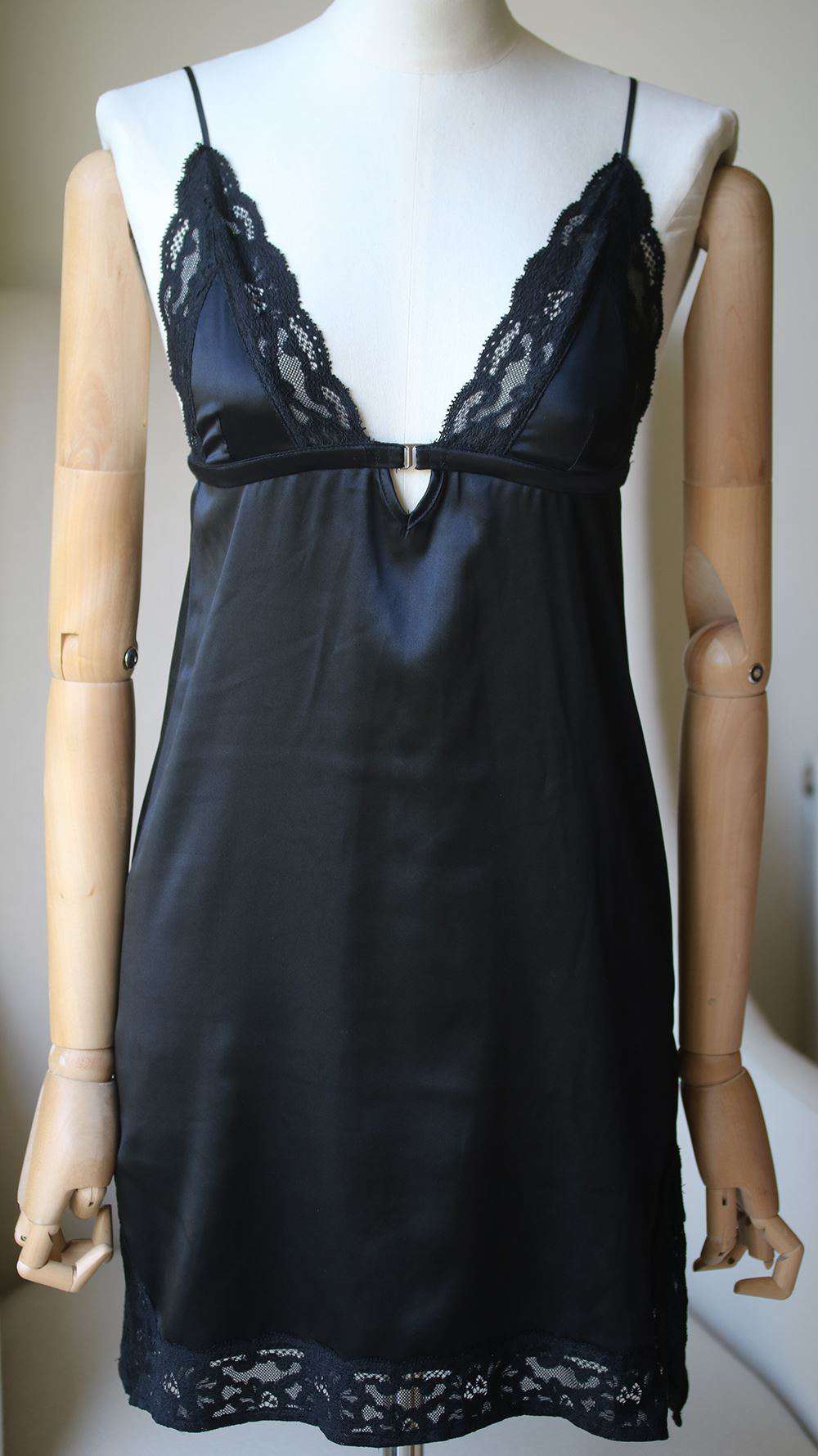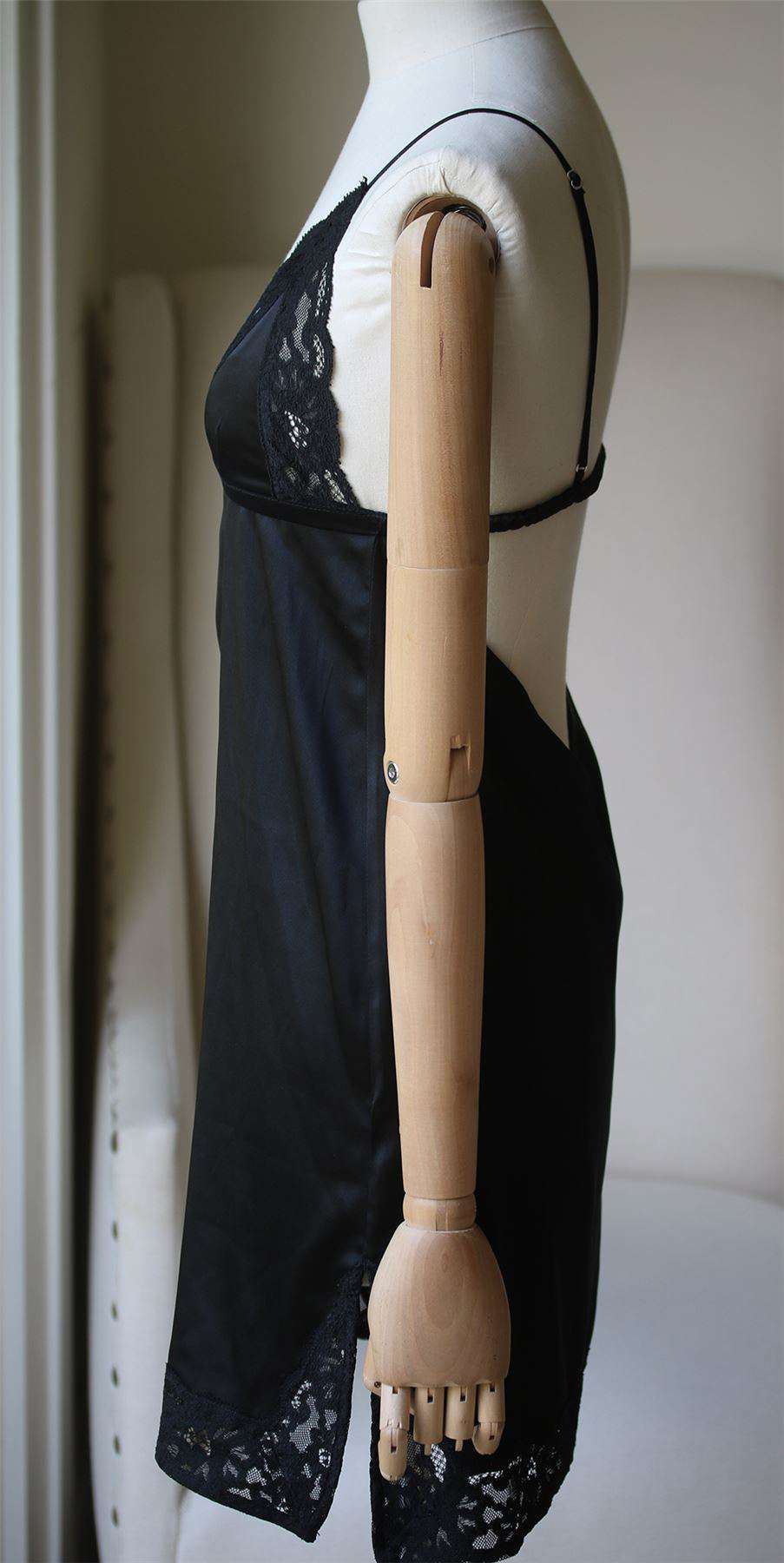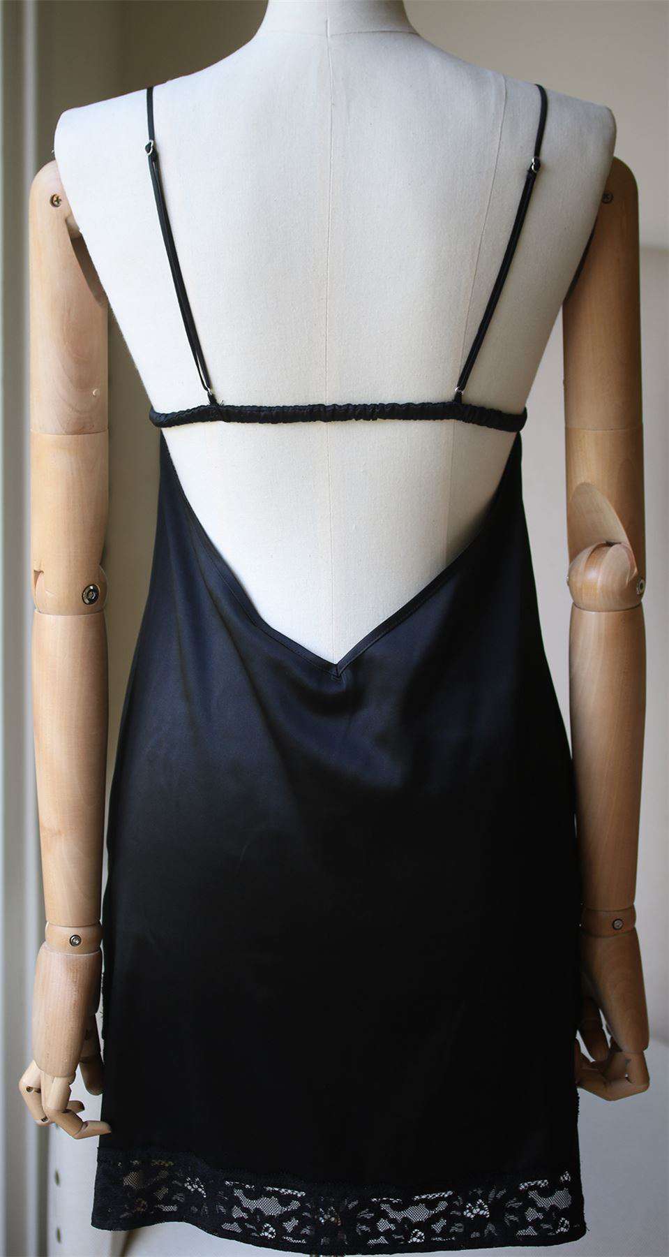 Our Charlotte stretch silk satin slip with lace trim is sexy, chic and comfortable. Triangle cups with adjustable straps, lace trimmed hem and side slits. Satin gathered elastic band with front keyhole detail and scoop cut-out back. 100% Silk.