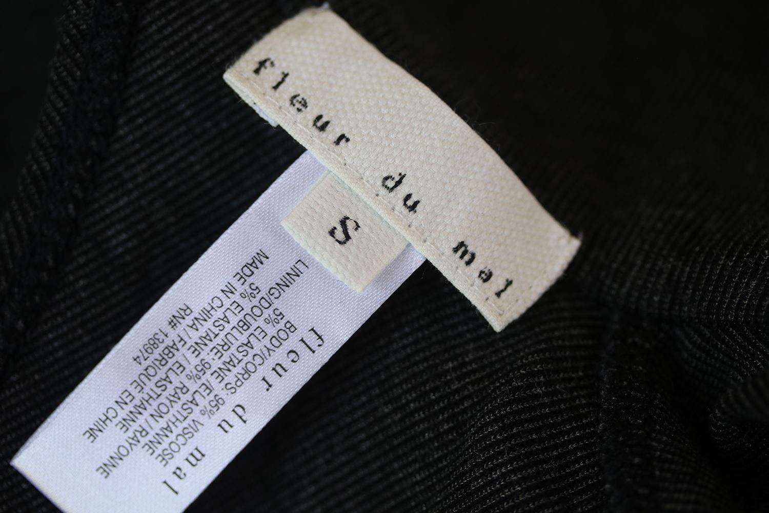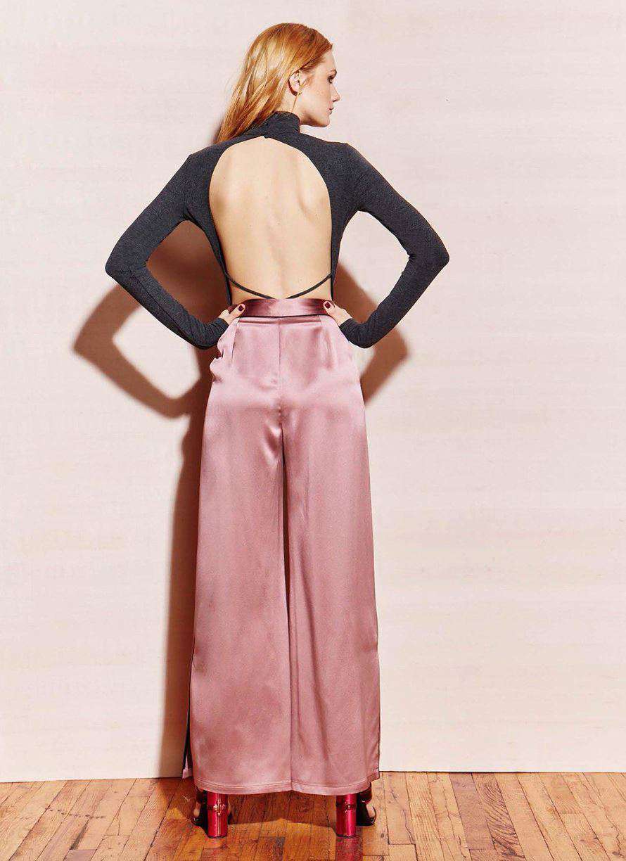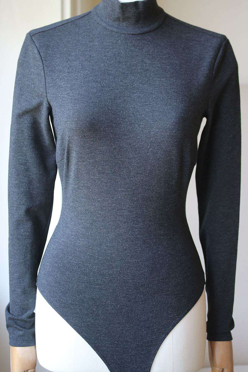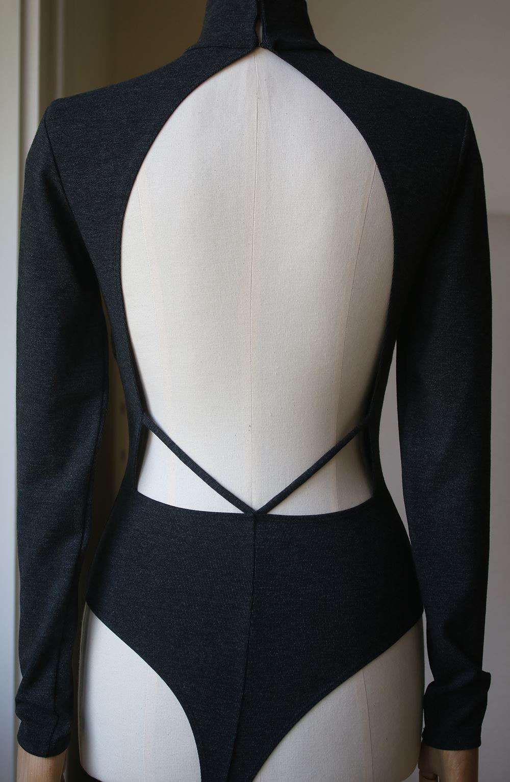 Party in the back: The Long Sleeve Turtleneck Bodysuit. Cut out open back with cross strap details. Soft Stretch Fabric with fully covered bottom. Snaps at back of neck and bottom seam. Looks great with jeans or dressed up with the Tuxedo Trousers. 95% Viscose, 5% Elastane.