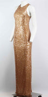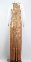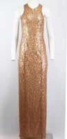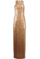 - This gown by Galvan London is cut from pink and gold sequined jersey and has a sleek silhouette that falls to a floor length, it has a racer back giving you that extra confidence.