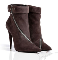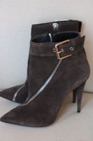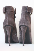 - Charcoal suede buckle and asymmetric zip ankle boots with 4 inch/110 heel.