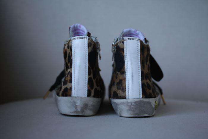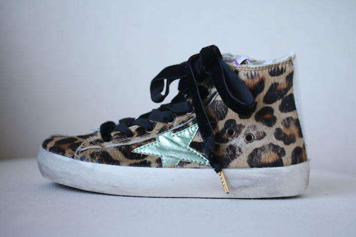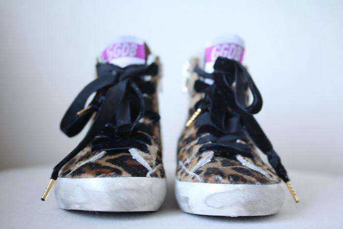 The classic distressed high-top trainers by Golden Goose in leopard print faux fur with black velvet laces.
