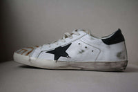 Golden Goose Deluxe Brand uses special waxes and brushing techniques to achieve its signature distressed finish. Crafted in Italy from supple off-white leather, these 'Super Star' sneakers are punctuated with a contrasting black star and zebra-print calf hair tongue. The spongy wedge heel and soft terry lining ensure the most comfortable fit. Concealed wedge heel measures approximately 40mm/ 1.5 inches. Off-white and black leather, off-white and sand calf hair. Lace-up front. Made in Italy.