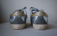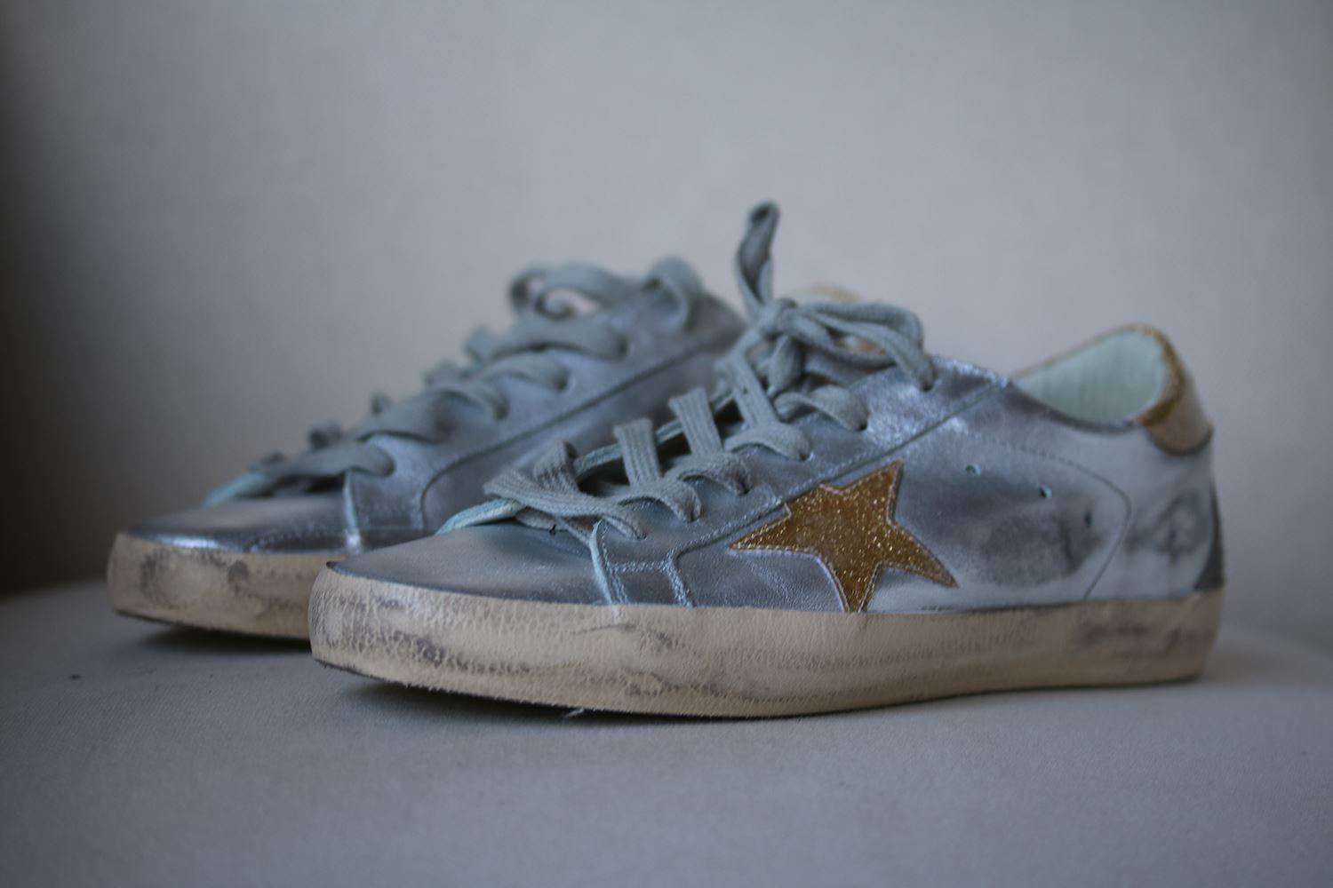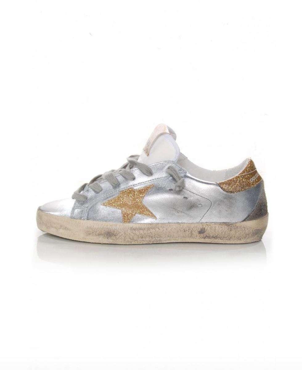 Crafted from silver-toned leather, these low-top Superstar sneakers by Golden Goose Deluxe Brand are detailed with contrasting gold-toned glitter appliqués. Featuring a rubber distressed-look sole, lace-up vamp and round toe, this metallic design was built for the weekend. Leather upper. Glitter gold detail.