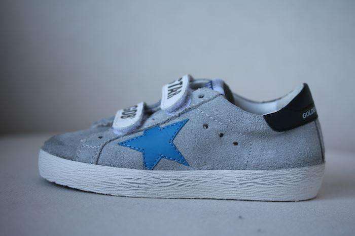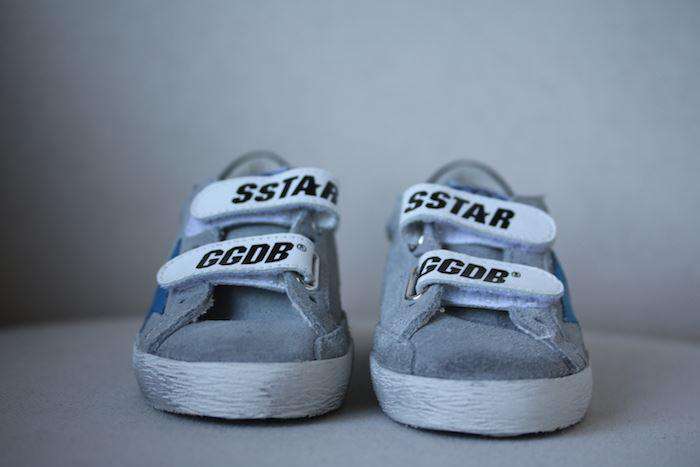 These iconic distressed sneakers by Golden Goose deluxe brand have grey suede body with white, black & blue leather detailing. Velcro fastening for easy changing.