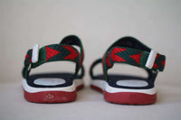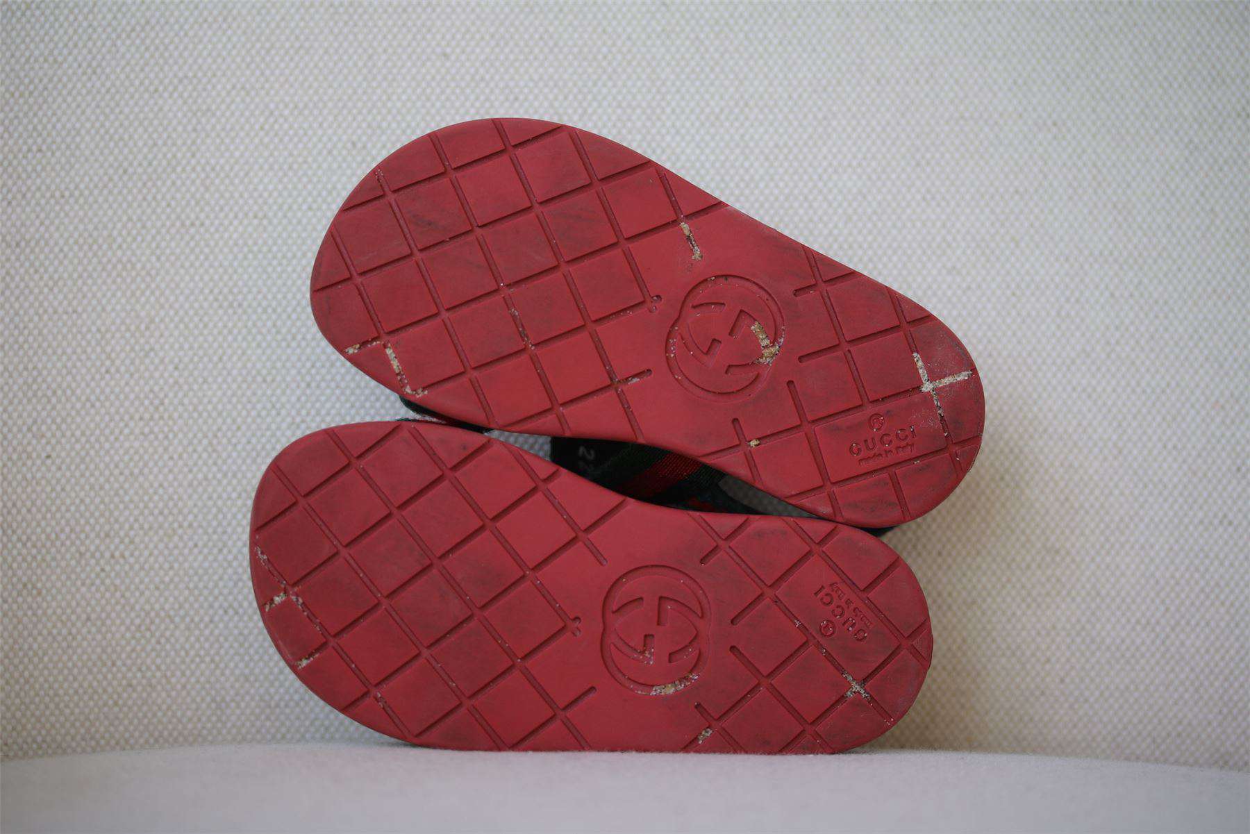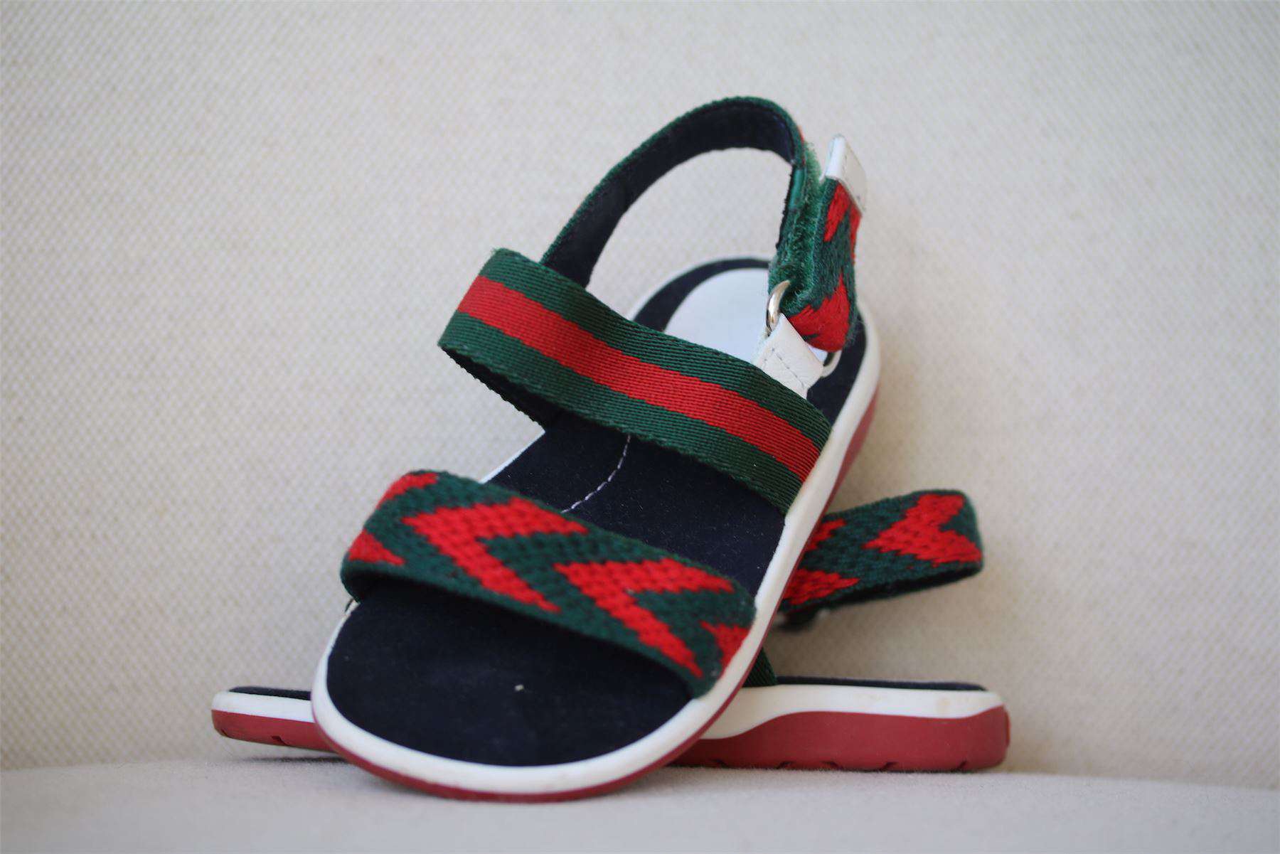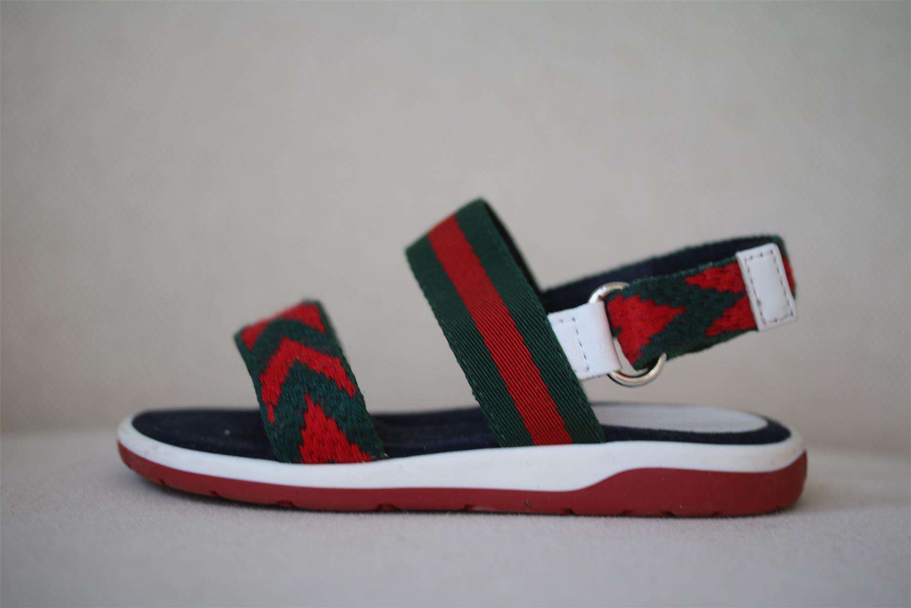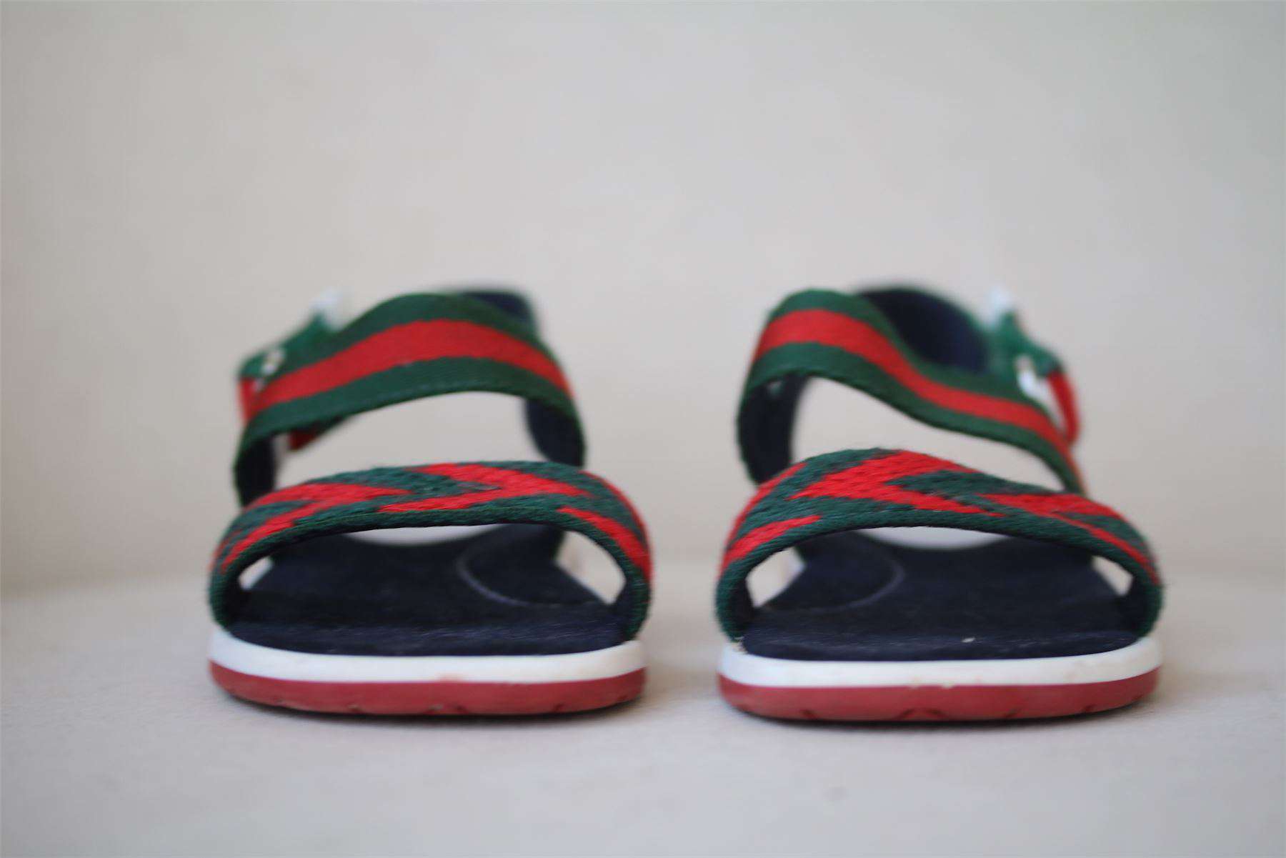 These sandals are uniquely designed by Gucci, with the designer's distinctive Web in green and red. The leather and textile chevron straps add to their luxury appeal, and they are lined in a beautifully soft, suede-like fabric with easy velcro fastening on the sides. Size - EU 22 (UK 5, US 6)