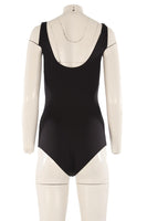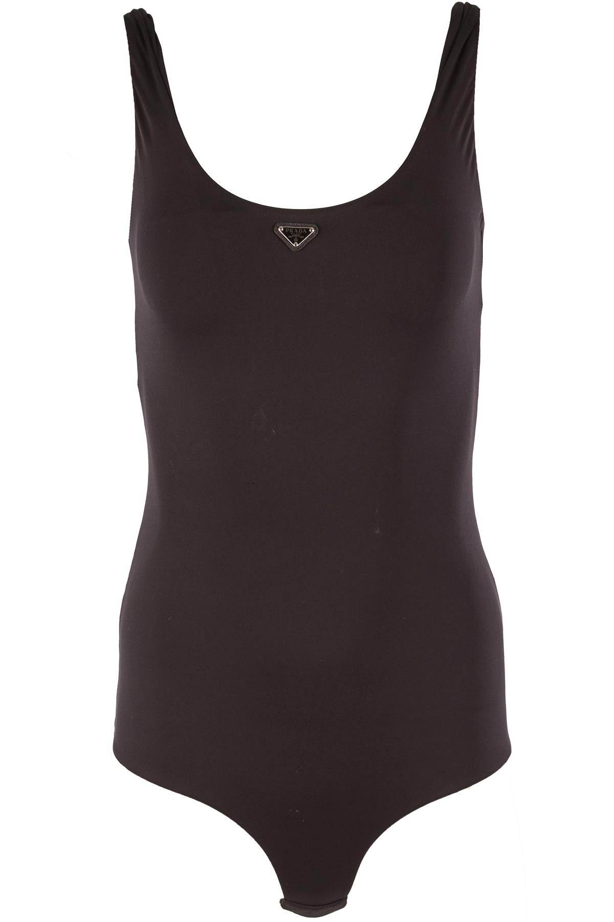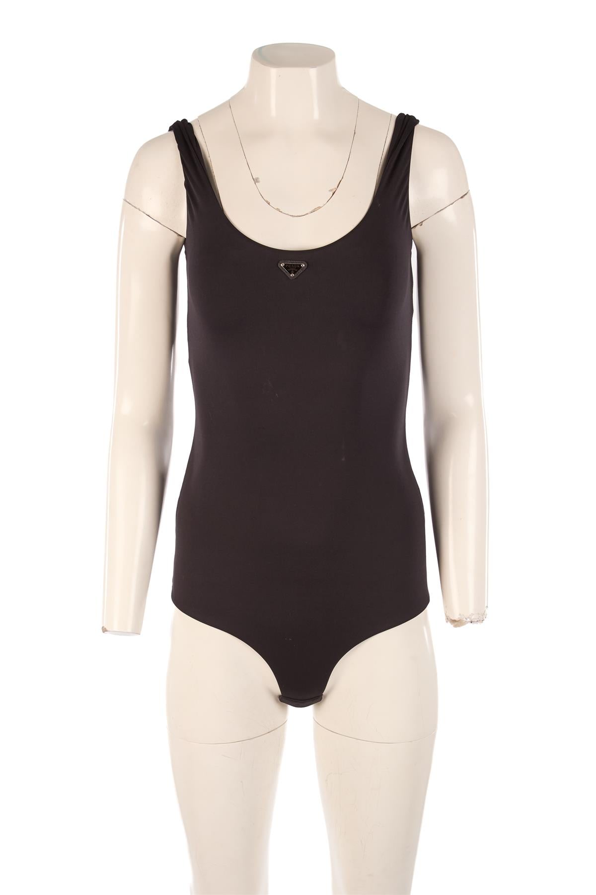Prada Black Bodysuit. Black. Sleeveless. Crewneck. Hook and eye fastening - Bottom. 85% Polyamide, 15% Elastane. IT 40 (UK 8, US 4, FR 36). Bust: 27.5 in. Waist: 22 in. Hips: 26 in. Length: 19.5 in.