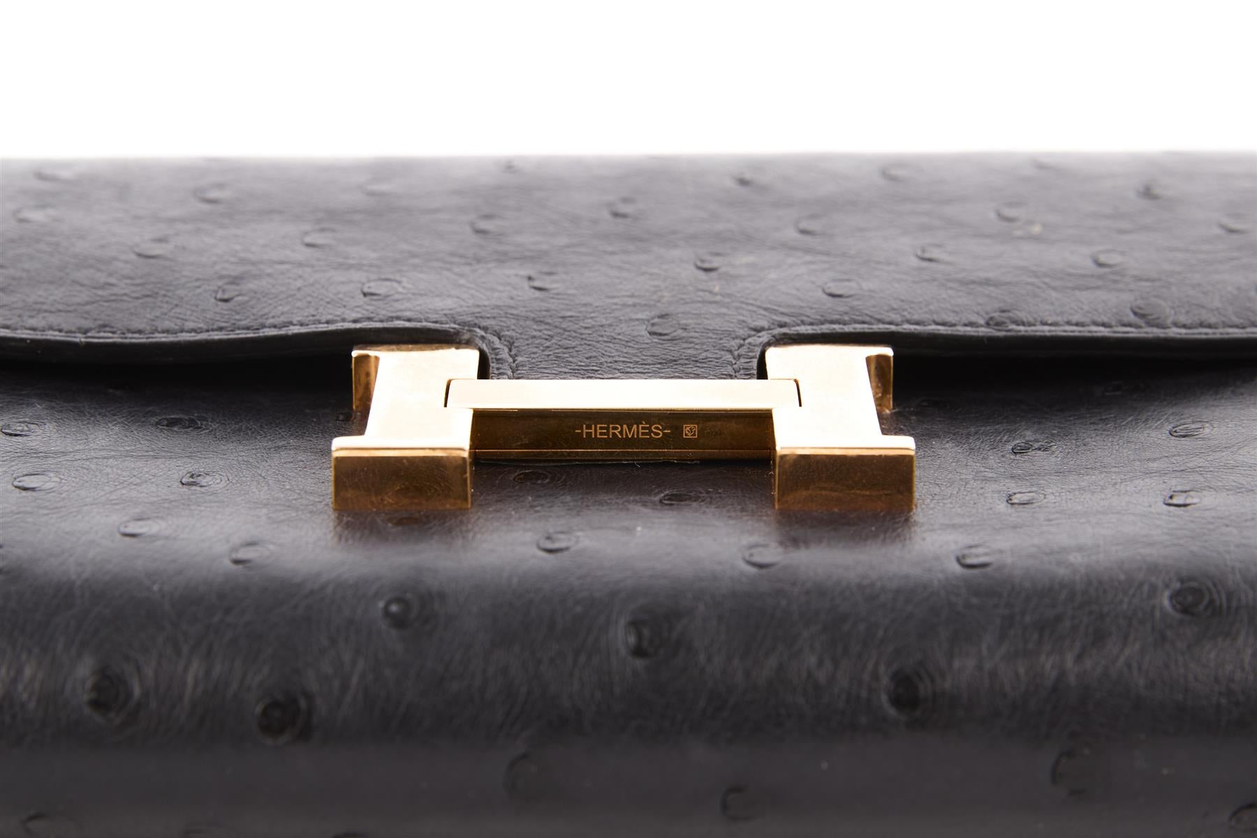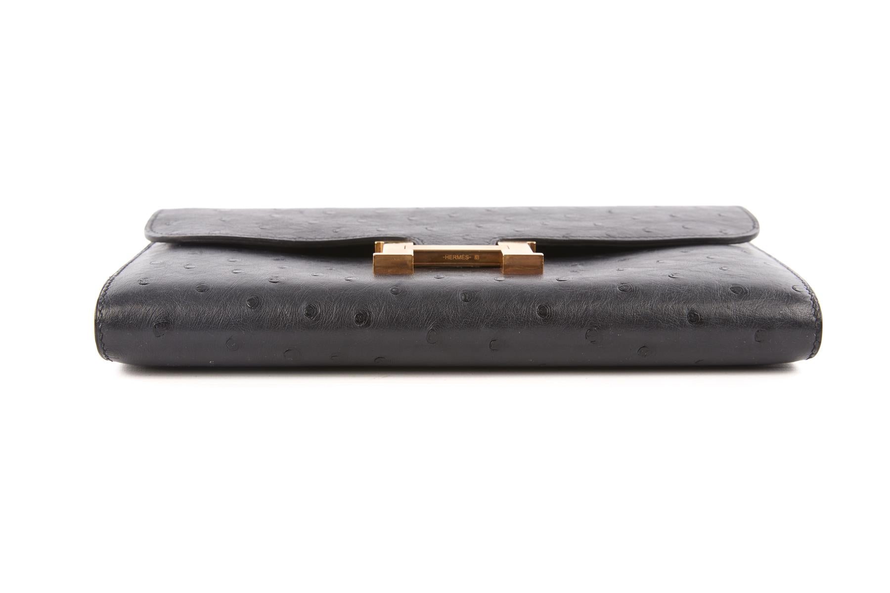 Hermès Navy 2018 Constance Long Ostrich Wallet In Bleu Indigo. Bleu Indigo. Push lock fastening - Front. Does not come with - dustbag or box. Constance. Height: 5.1 in. Width: 8 in. Depth: 1 in.