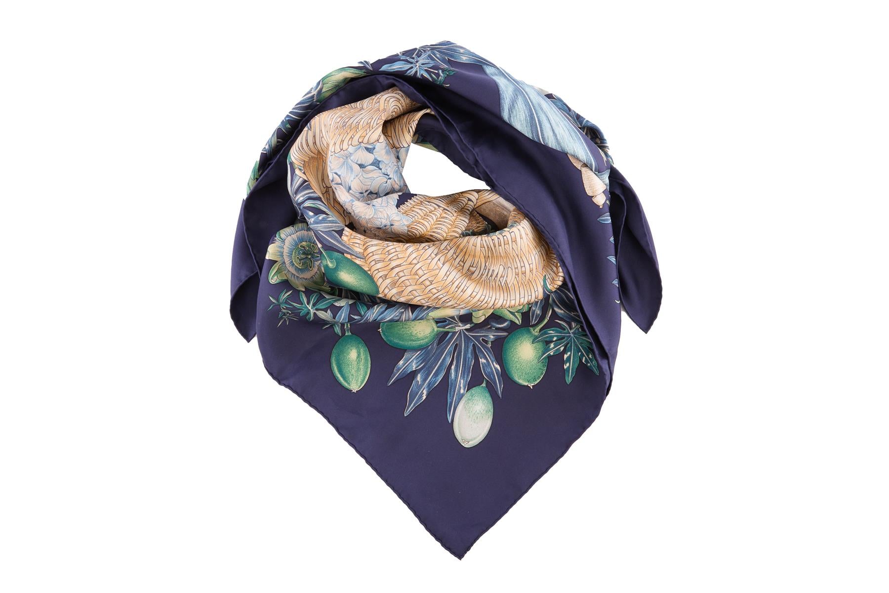 Hermès Navy Passiflores Silk Scarf. Navy. Tie fastening - Front. Comes with - box. Length: 35 in. Width: 35 in.