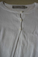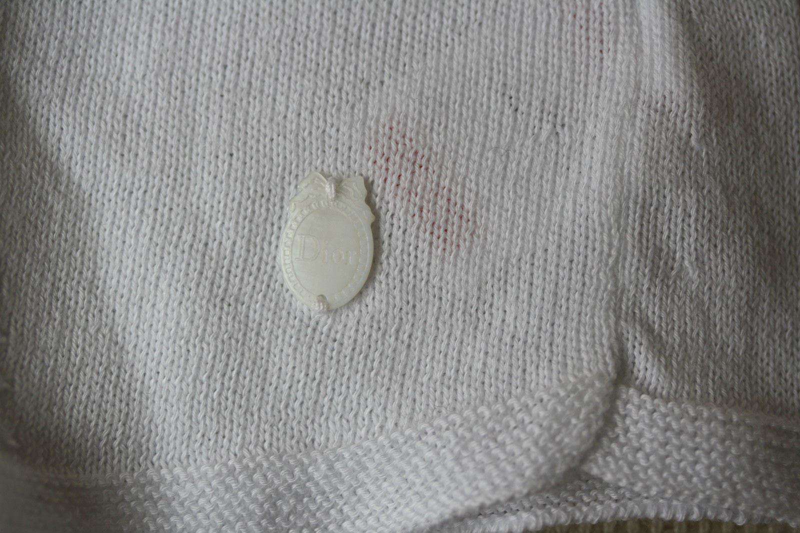 This adorable ivory white lightweight knit cardigan has longsleeves, a round collar, front button closure with no pockets and a Dior motif.
