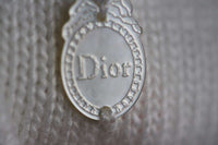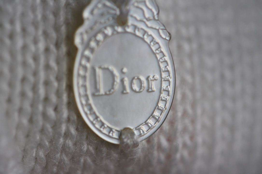 This adorable ivory white lightweight knit cardigan has long sleeves, a round collar, front button closure with no pockets and a dior motif. In a cashmere and silk blend.