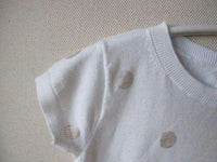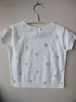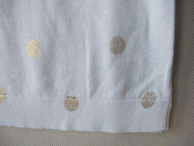 Super soft cream cotton blend short-sleeved sweater with gold polka dot accents.