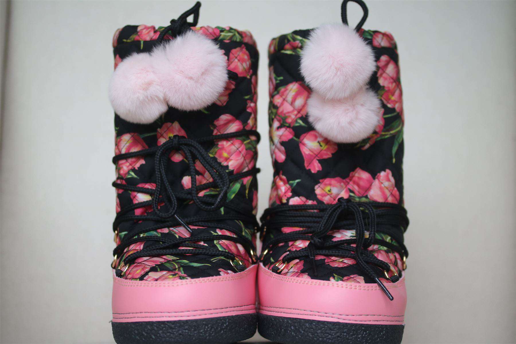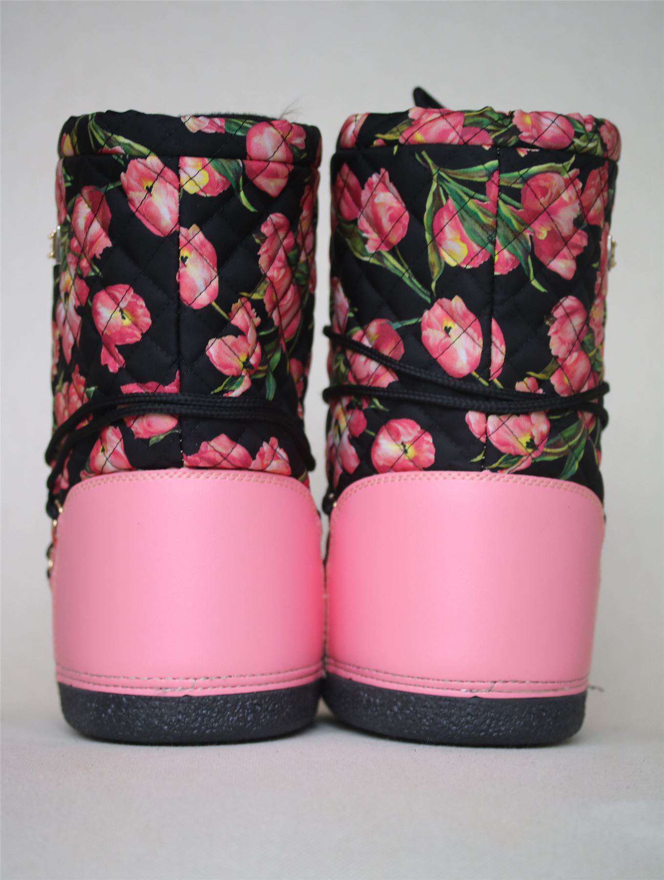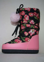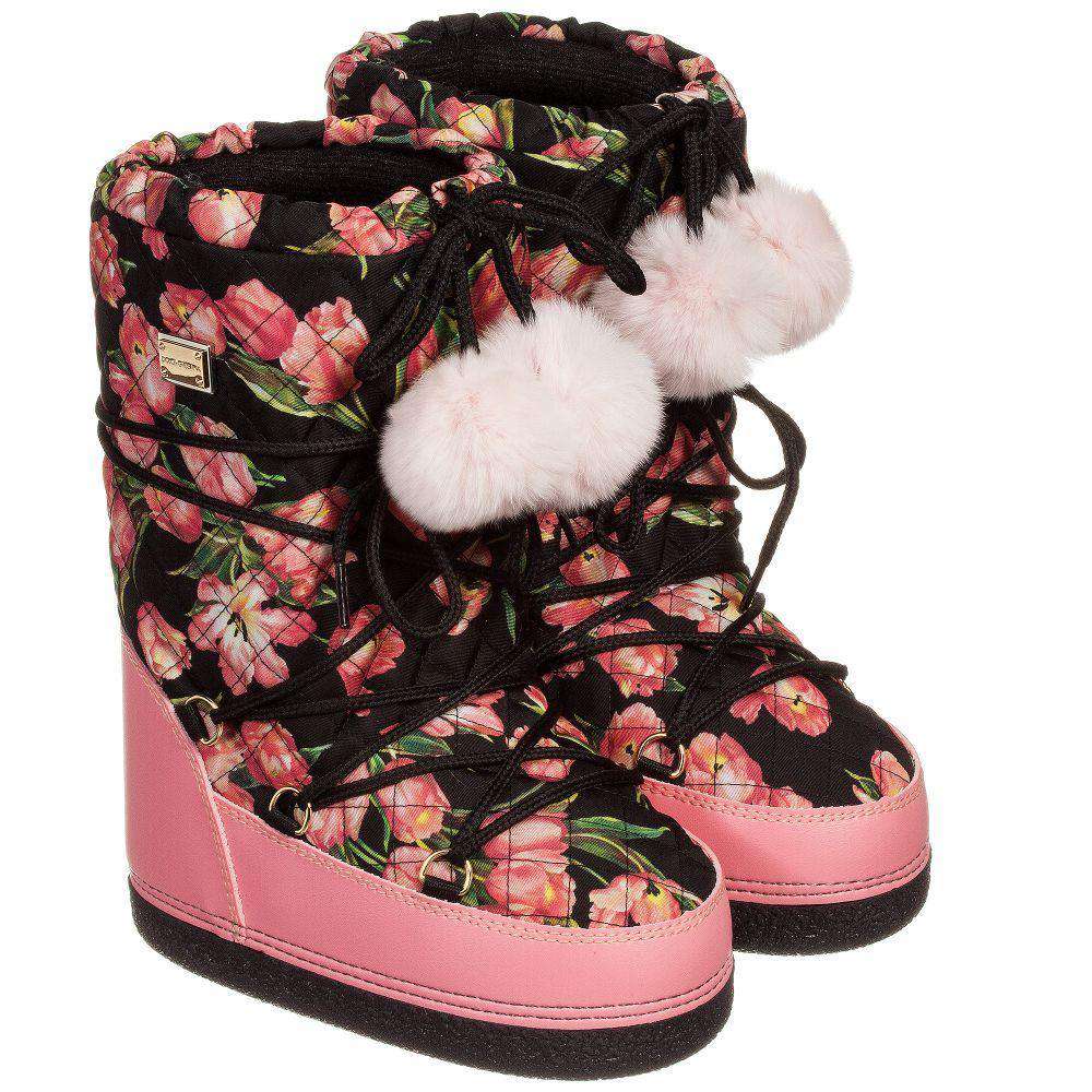 Dolce & Gabbana, girls quilted snow boots featuring the designer's pink tulip print. They have a soft synthetic leather trim around the foot, with laces across the foot and around the ankle. They are padded for warmth and comfort and the soles are textured to provide a non-slip grip. The tops of the boots have a drawstring with super soft fur pom-poms.