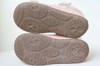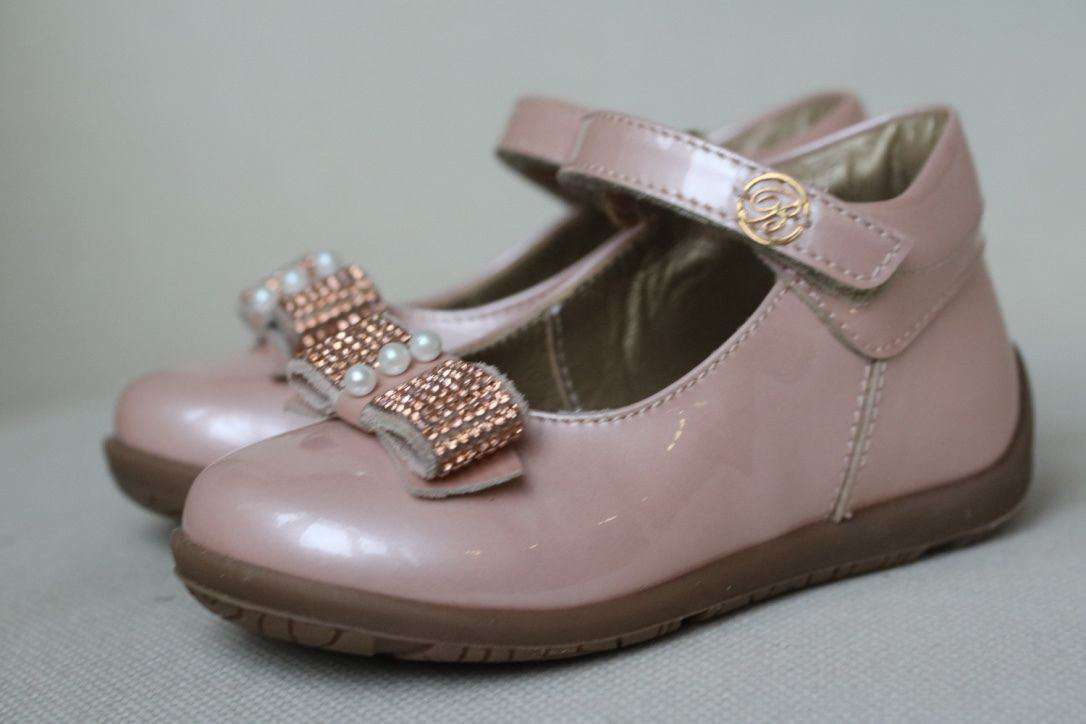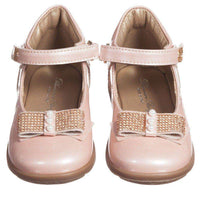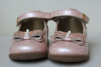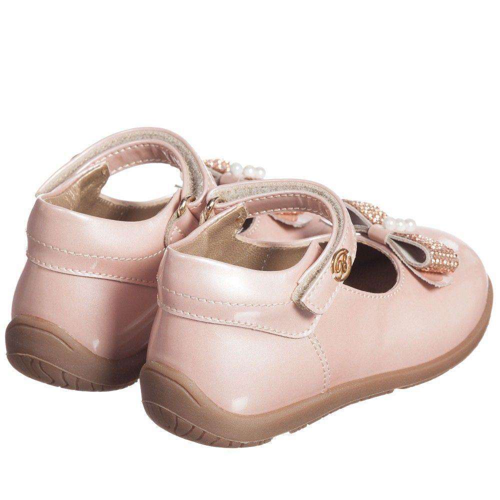 Gorgeous pink pearlescent leather shoes by Miss Blumarine. Made in soft and supple leather, they have a velcro strap fastening and are fully lined in soft leather, with a cushioned instep. They have a non-slip rubber sole and pretty diamante bows across the toes.