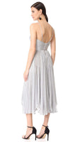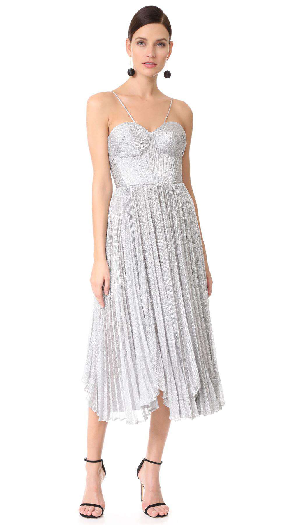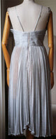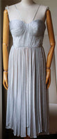 Silvery, fine-knit fabric creates an exquisite shimmering finish on this Maria Lucia Hohan dress. Sculpted bustier bodice with boning throughout and molded cups. Filmy ruffles trim the hidden back zip. Spaghetti straps. Sand-tone bodysuit lining with bikini-cut panty and snap gusset. Fabric: Metallic fine knit. 62% Nylon, 28% spandex.