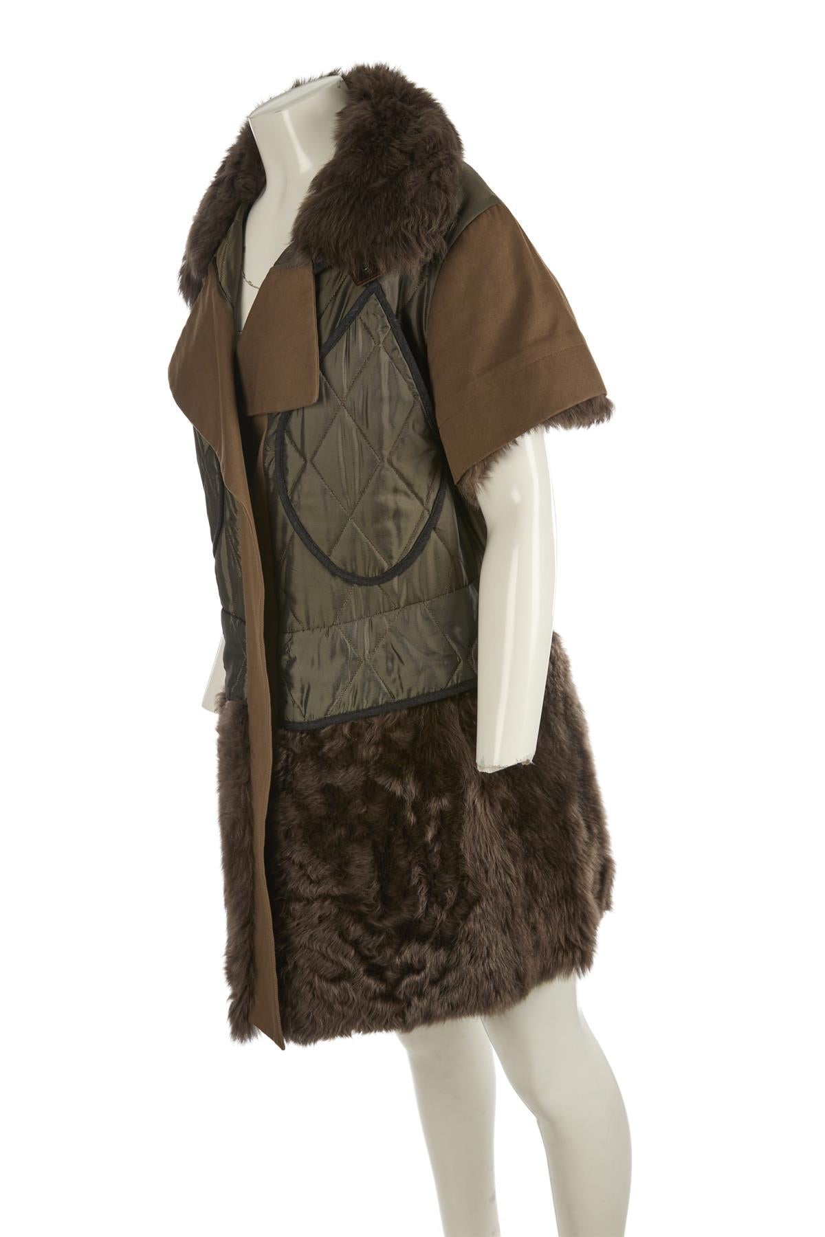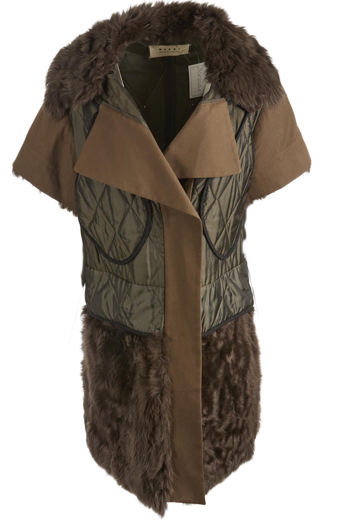 Marni Brown 2010 Shearling And Cotton Coat. Brown and khaki. Short Sleeve. V-Neck. Button fastening - Front. 47% Cupro, 46% Cotton, 5% Lamb leather, 2% Elastane, 100% Polyester. IT 40 (UK 8, US 4, FR 36). Shoulder to Shoulder: 15.5 in. Bust: 38 in. Waist: 39 in. Hips: 20 in. Length: 36 in.