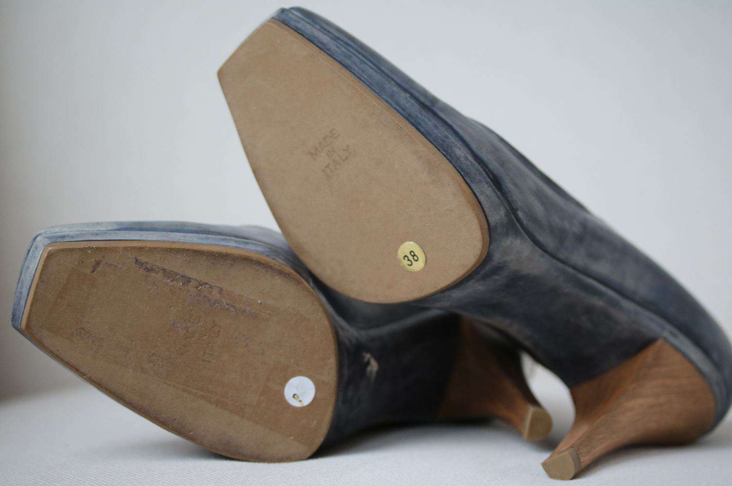 Calfskin leather wooden heeled pumps in washed blue. Square toe. Wooden platform covered in leather and block heel. Leather in washed blue. Calfskin. Colour: washed blue.