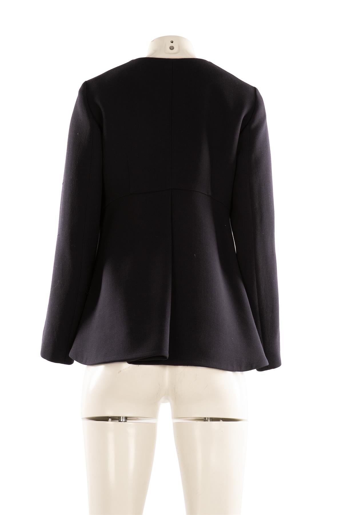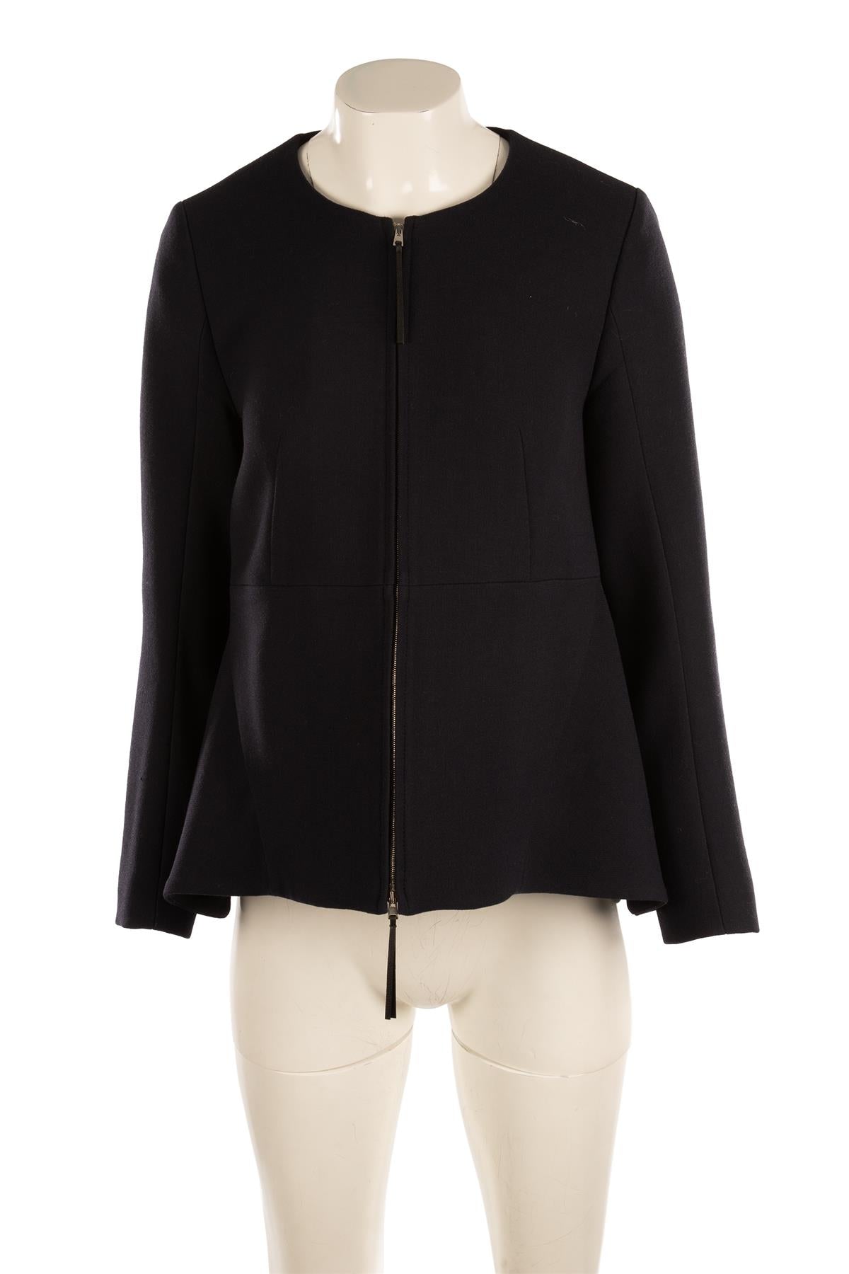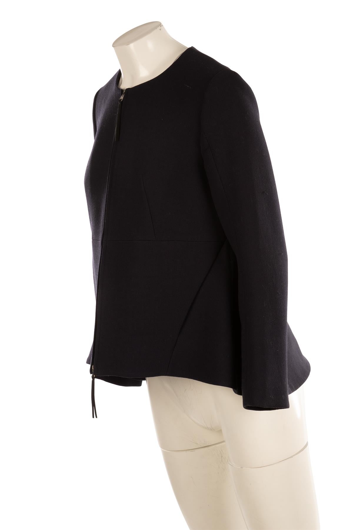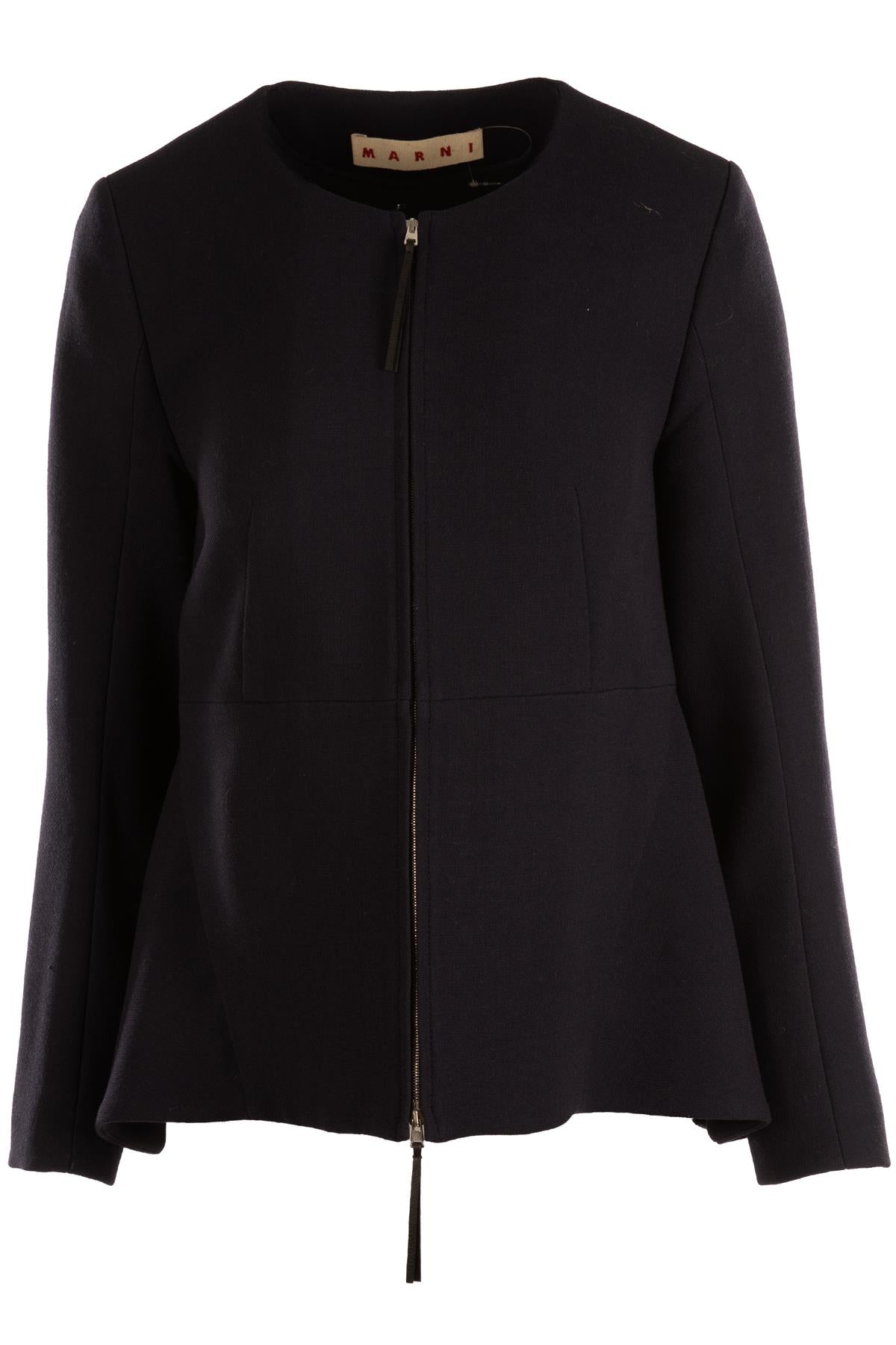 Marni Navy Wool Jacket. Navy. Long Sleeve. Scoop Neck. Zip fastening - Front. 100% Wool, 100% Viscose. IT 42 (UK 10, US 6, FR 38). Bust: 34 in. Waist: 34 in. Hips: 52 in. Length: 26 in.