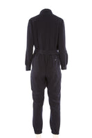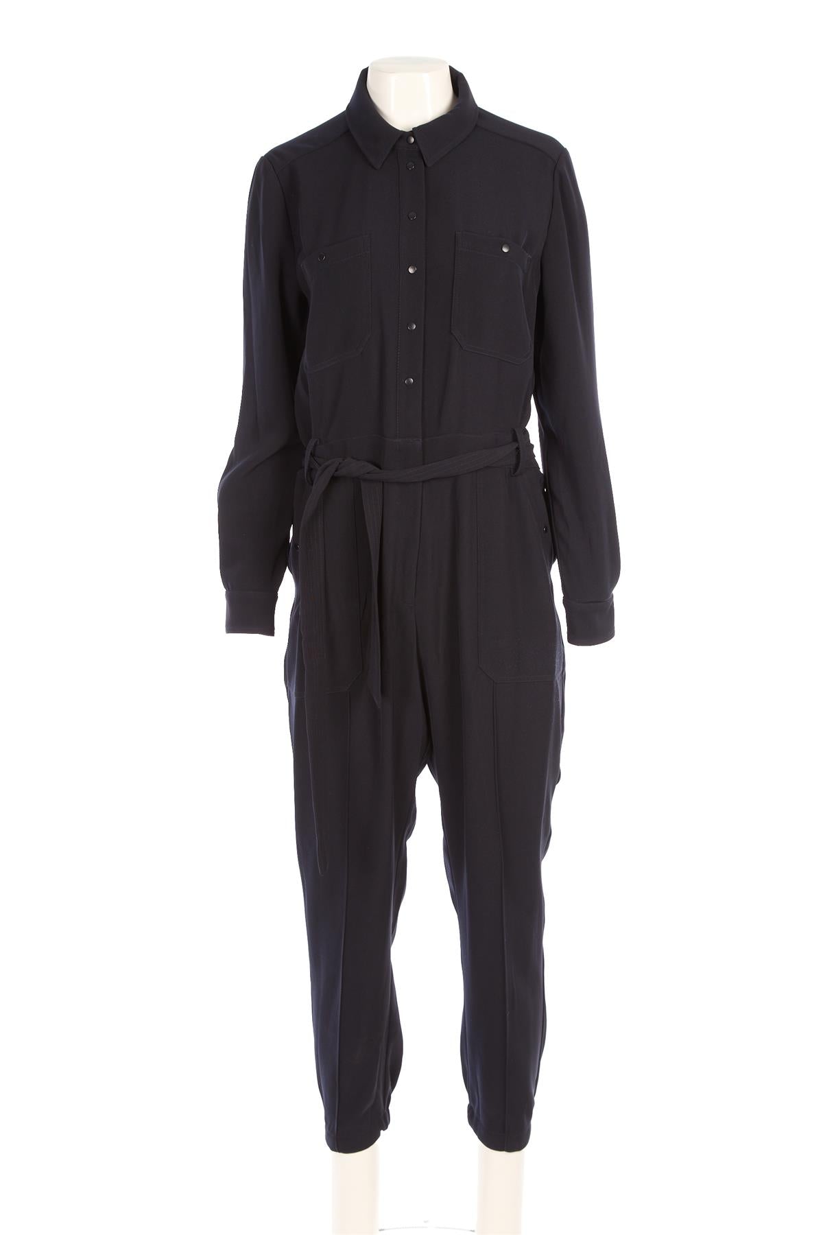 Me+Em Black Woven Jumpsuit. Black. Short Sleeve. Crewneck. Button and zip fastening - Front. 100% Polyester. UK 12 (US 8, FR 40, IT 44). Bust: 40 in. Waist: 31 in. Hips: 48 in. Length: 58 in. Inseam: 29.5 in. Rise: 14 in.