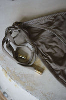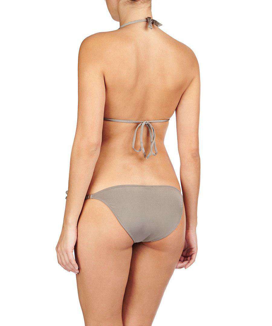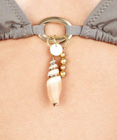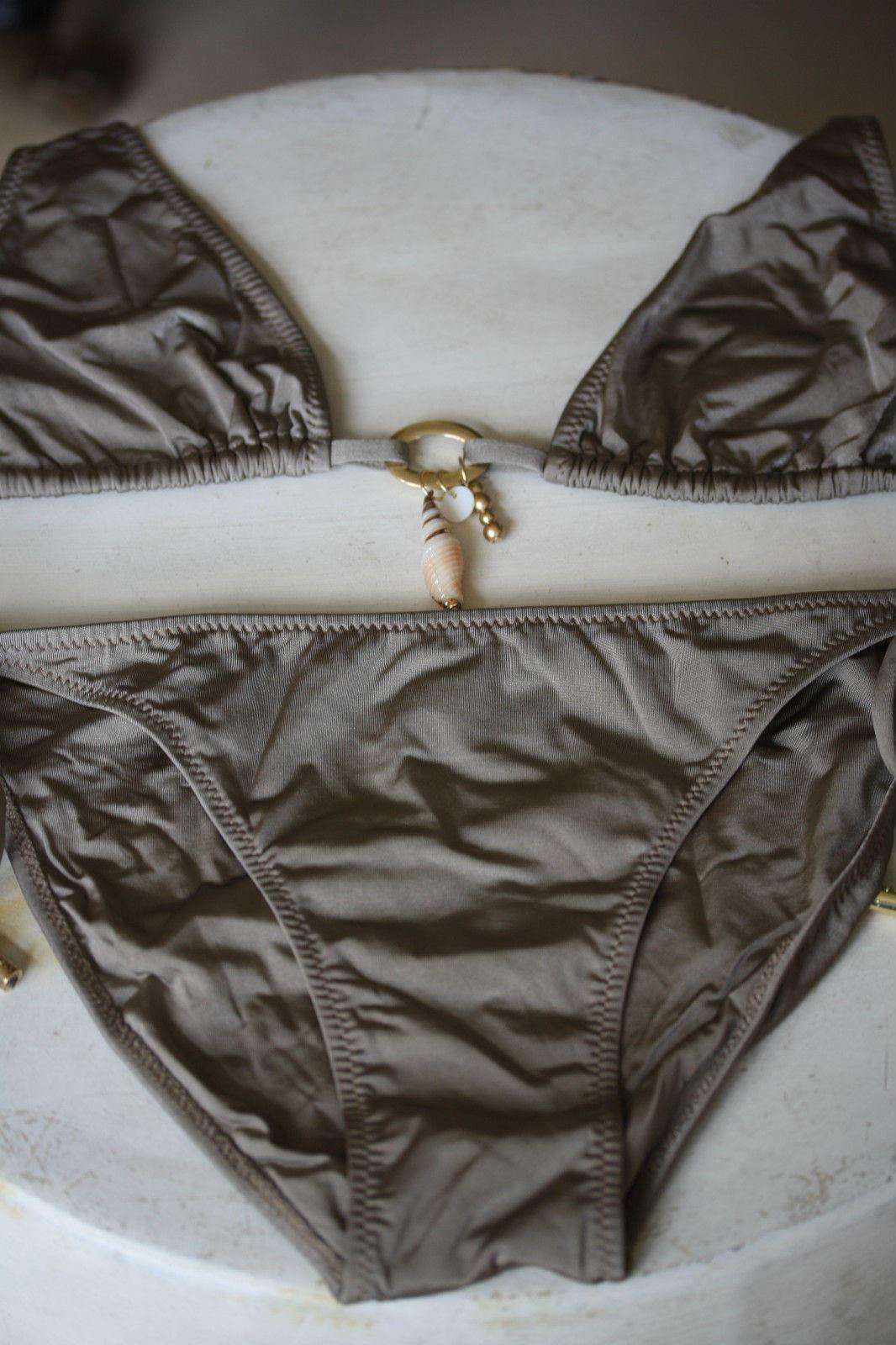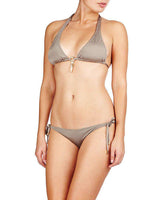 The elegant halterneck bikini by Melissa Odabash in faintly shiny khaki delights with a beautiful sea shell between the cups. A precious underwater treasure in which you will shine also on land.