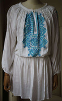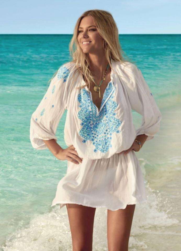 On a deserted golden beach, stroll amongst the lush palms and tropical wildlife sporting our Nadja Embroidered Short Dress in White Blue Celeste. Let the lightweight fabric fall effortlessly down your body, benefiting from a flexible waist to ensure a flawless finish. Boasting an open V-shape neckline and intricately embroidered detailing. 100% Viscose.