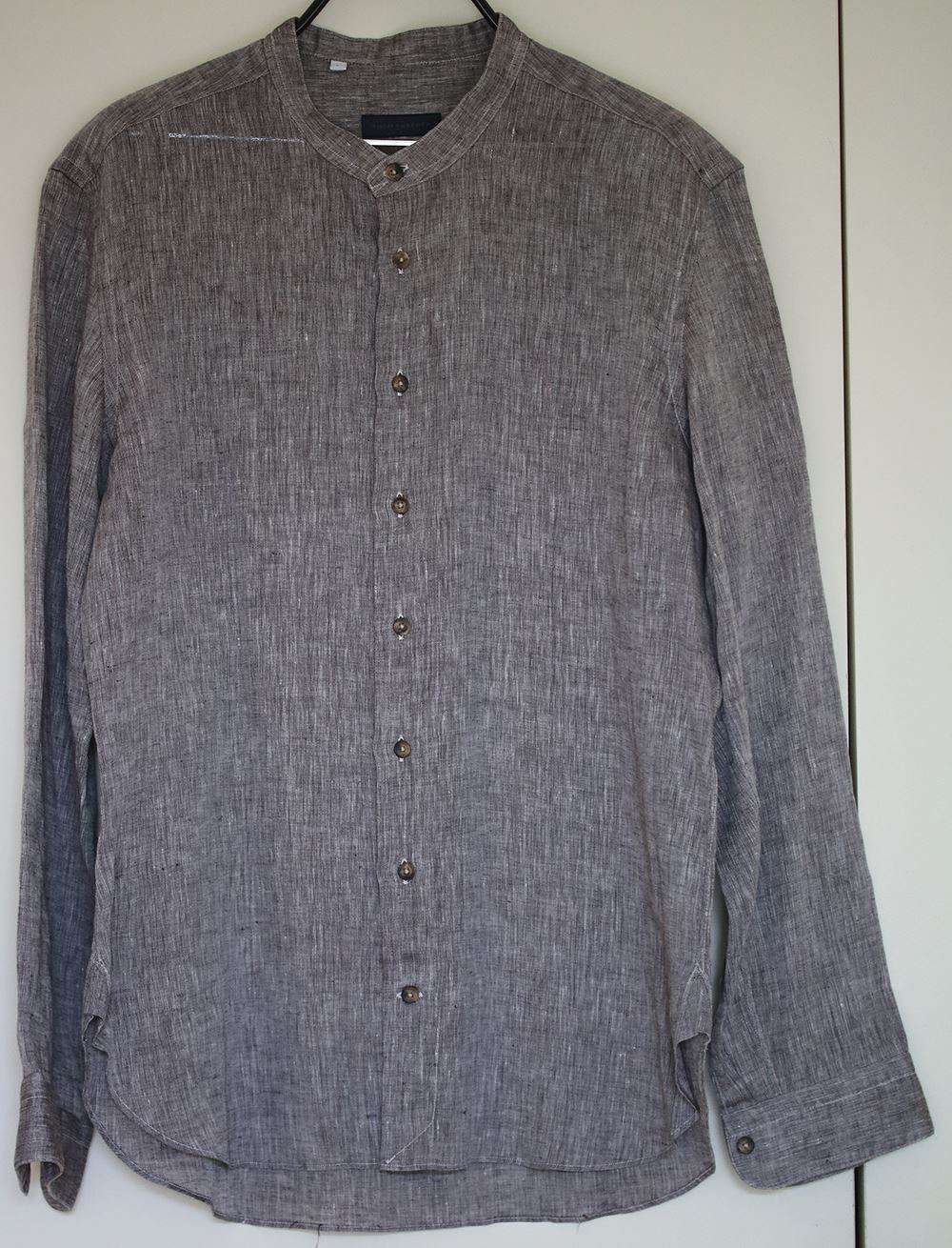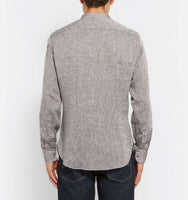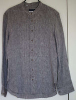 The grandad collar on this Thom Sweeney shirt gives it a stylish edge, while the earthy mushroom hue and tactile slub linen handle imbue a rugged look and feel. Offset the tone by wearing it with shades of blue; try jeans for a casual take or navy chinos to go a little more polished. Take your normal size. This shirt has a slim cut, but is designed to be not too fitted. Mushroom slub linen. Grandad collar, buttoned cuffs. Button fastenings. 100% linen. Made in the UK. Colour: natural.