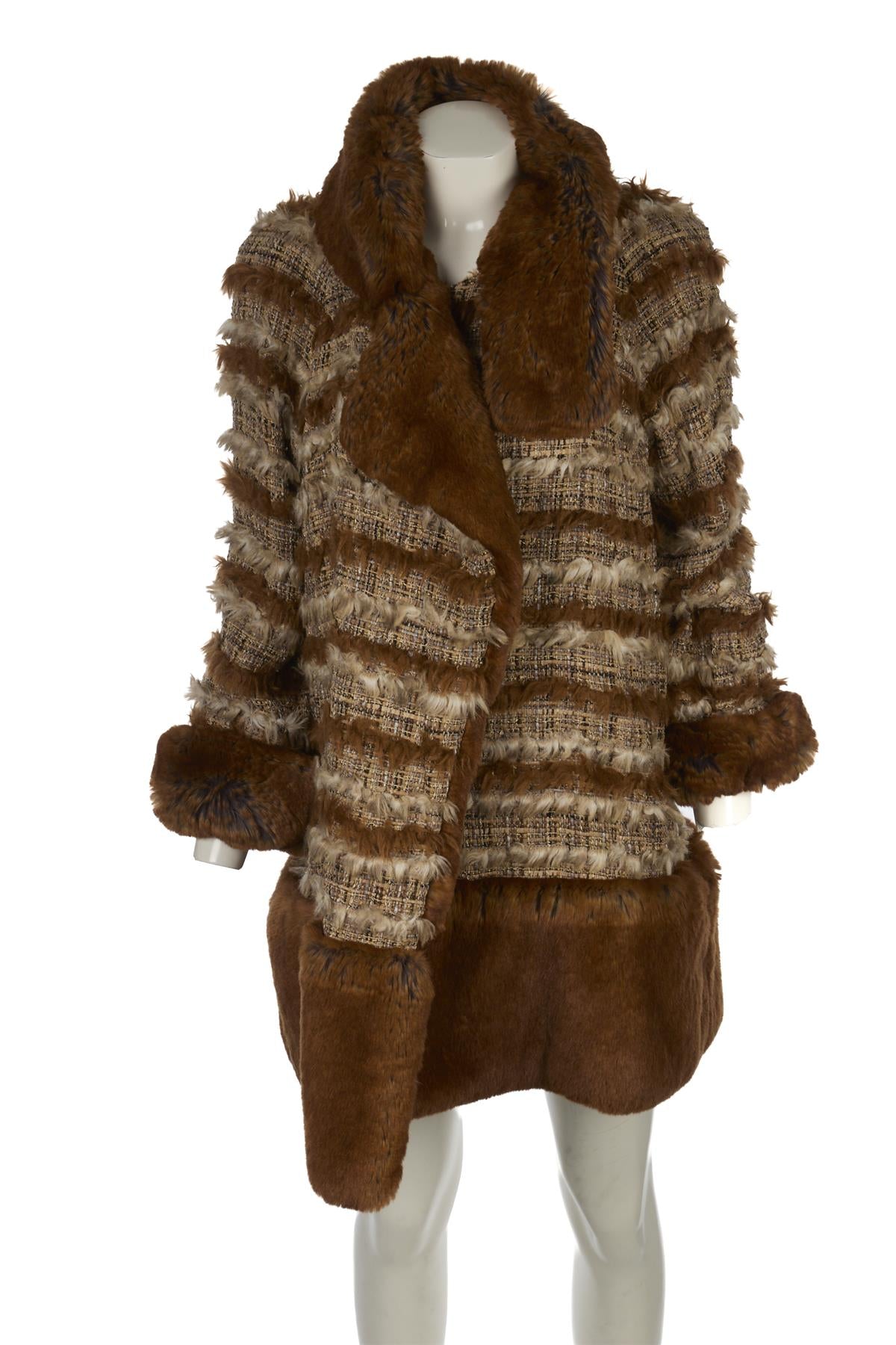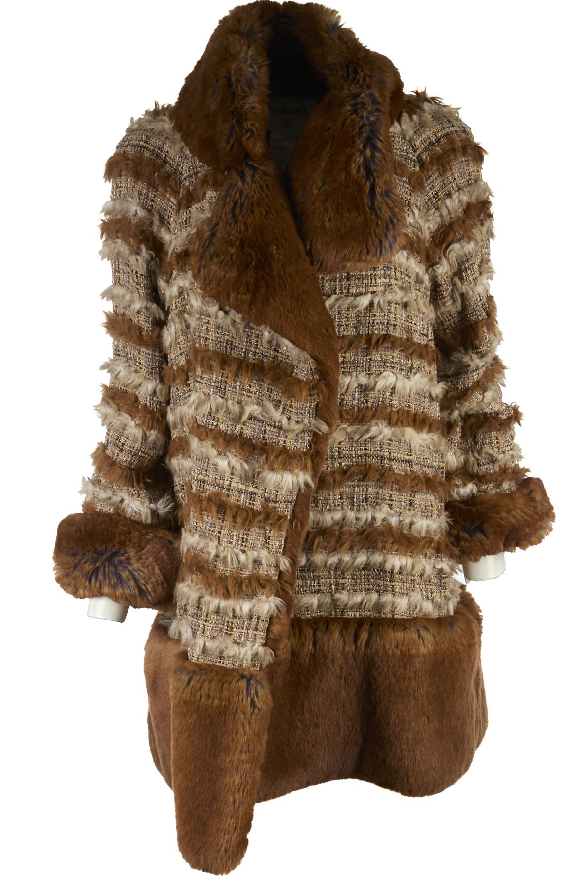 CHANEL BROWN 2010 FAUX FUR AND TWEED COAT FR 38 UK 10
