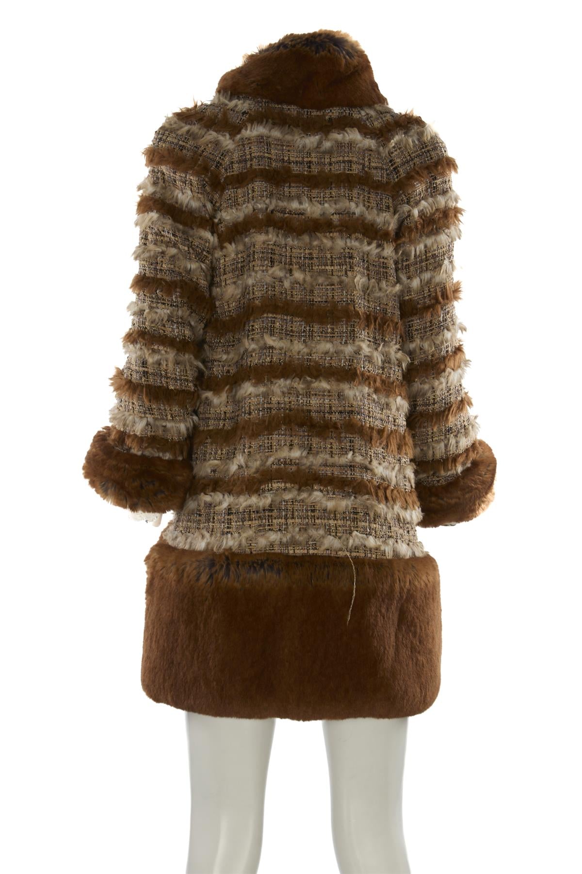 Chanel Brown 2010 Faux Fur And Tweed Coat. Brown and cream. Long Sleeve. Crewneck. Button fastening - Front. 87% Acrylic, 13% Cotton, 100% Silk, 85% Acrylic, 15% Cotton. FR 38 (UK 10, US 6, IT 42). Shoulder to Shoulder: 19 in. Bust: 32 in. Waist: 32 in. Hips: 38 in. Length: 33 in.