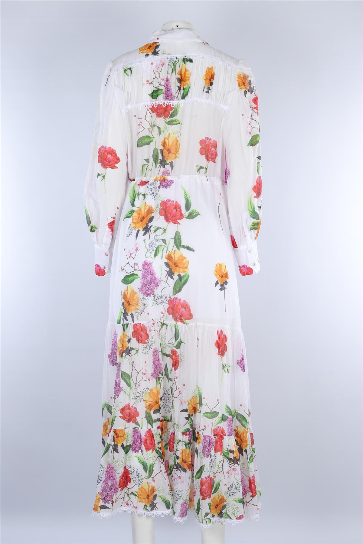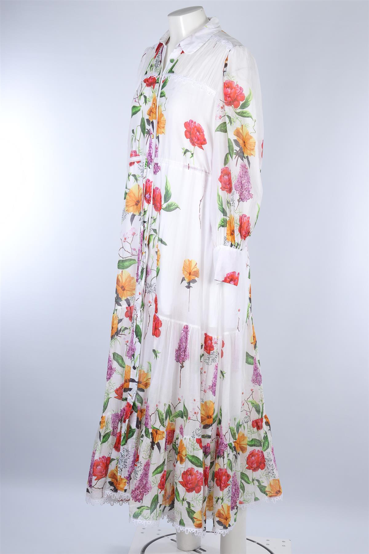 Charo Ruiz White Cotton Maxi Dress. White. Long Sleeve. V-Neck. Button fastening - Front. 90% Cotton, 10% Polyester. Large (UK 12, US 8, FR 40, IT 44). Bust: 42 in. Waist: 42 in. Hips: 56 in. Length: 56 in.