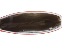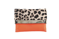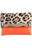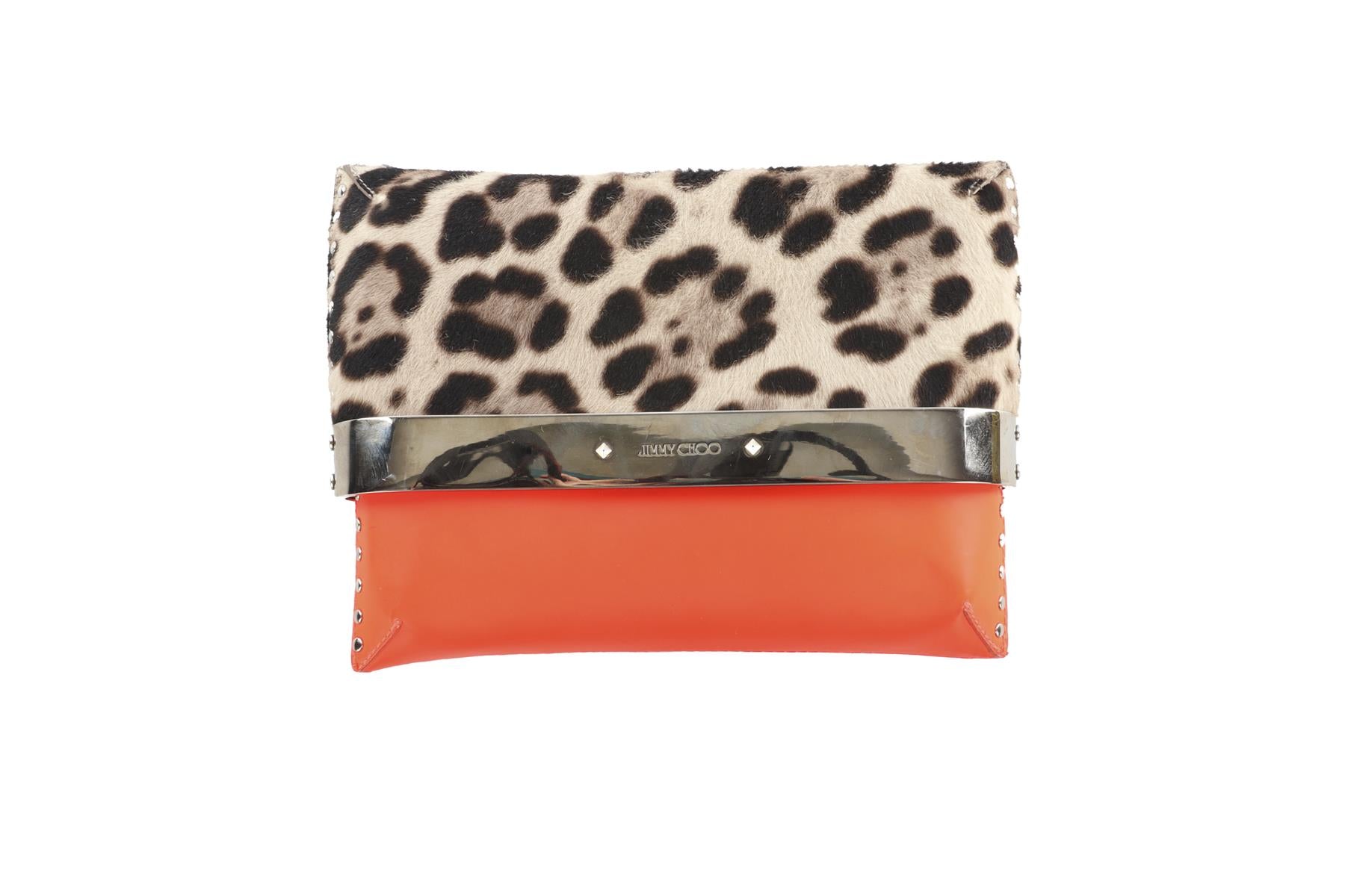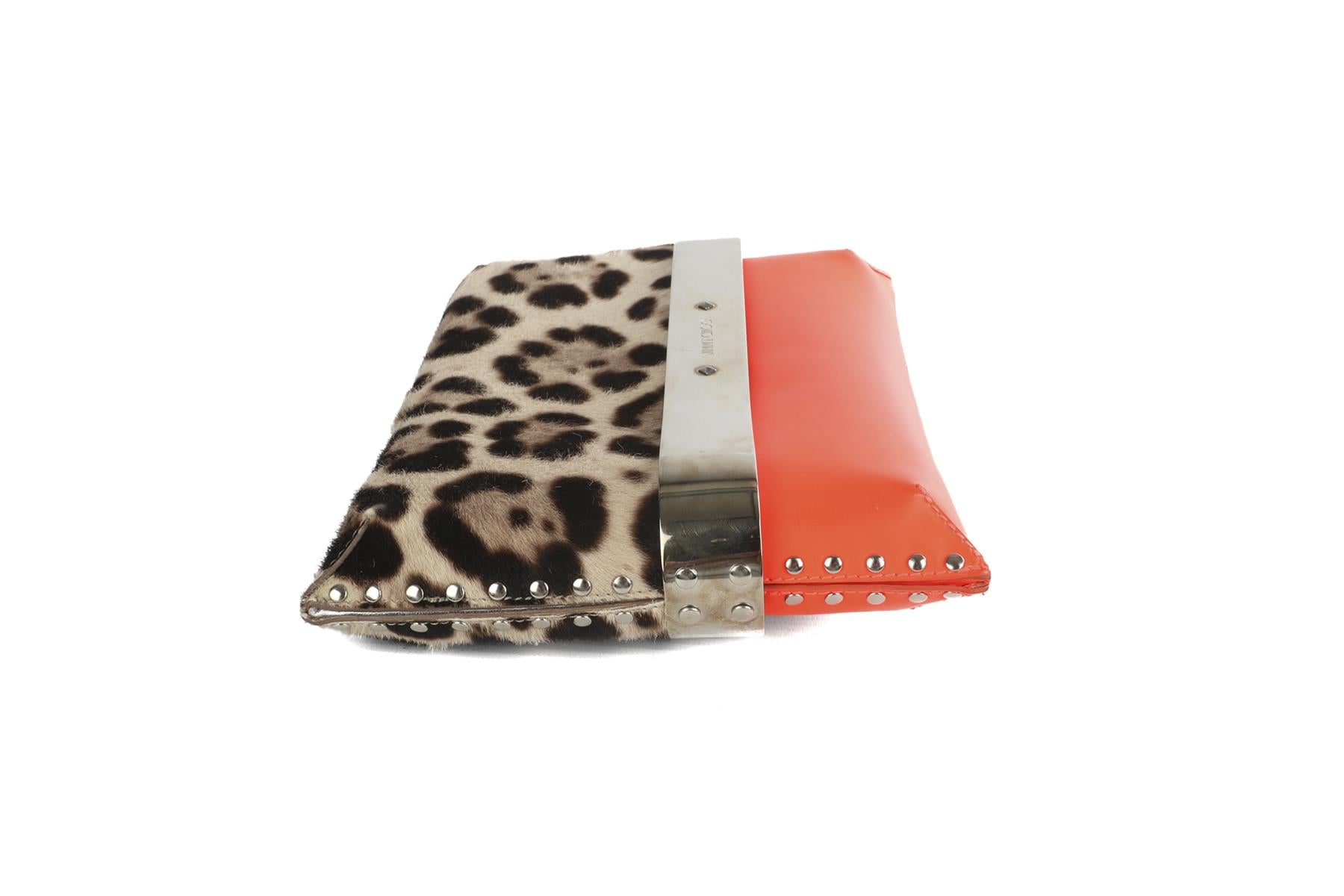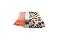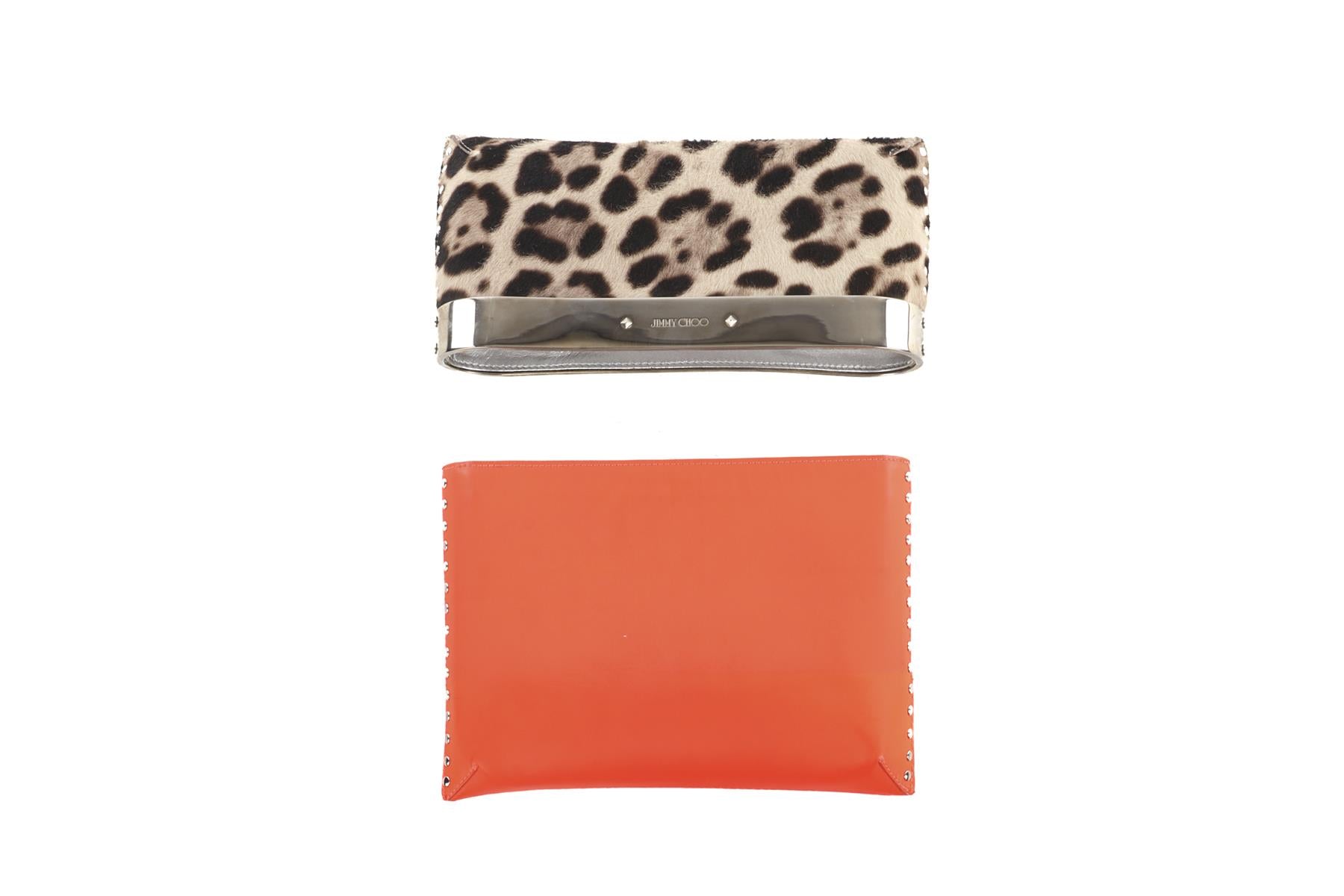 Fair condition - Orange pouch: Light scuffing to corners and edges. Moderate marks and residue to exterior material. Very tiny tear to exterior material. Moderate creasing and rippling to exterior material. Moderate marks and fraying to interior material. Leopard pouch: Light scuffing to calf hair exterior. Moderate tarnishing to hardware. Extensive scratching to hardware; see pictures.