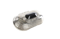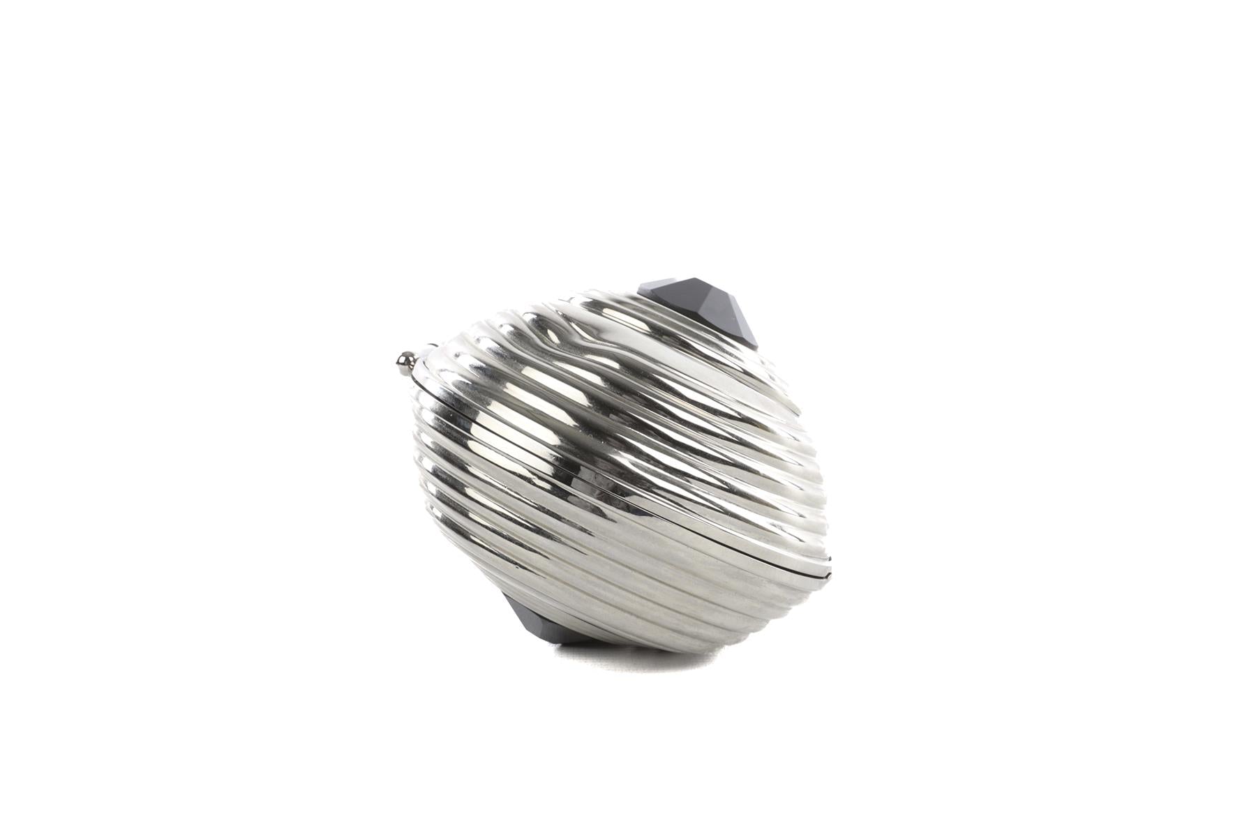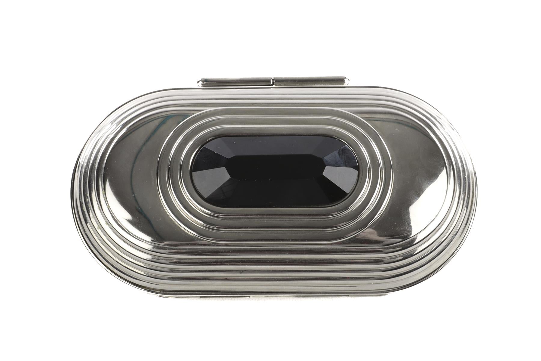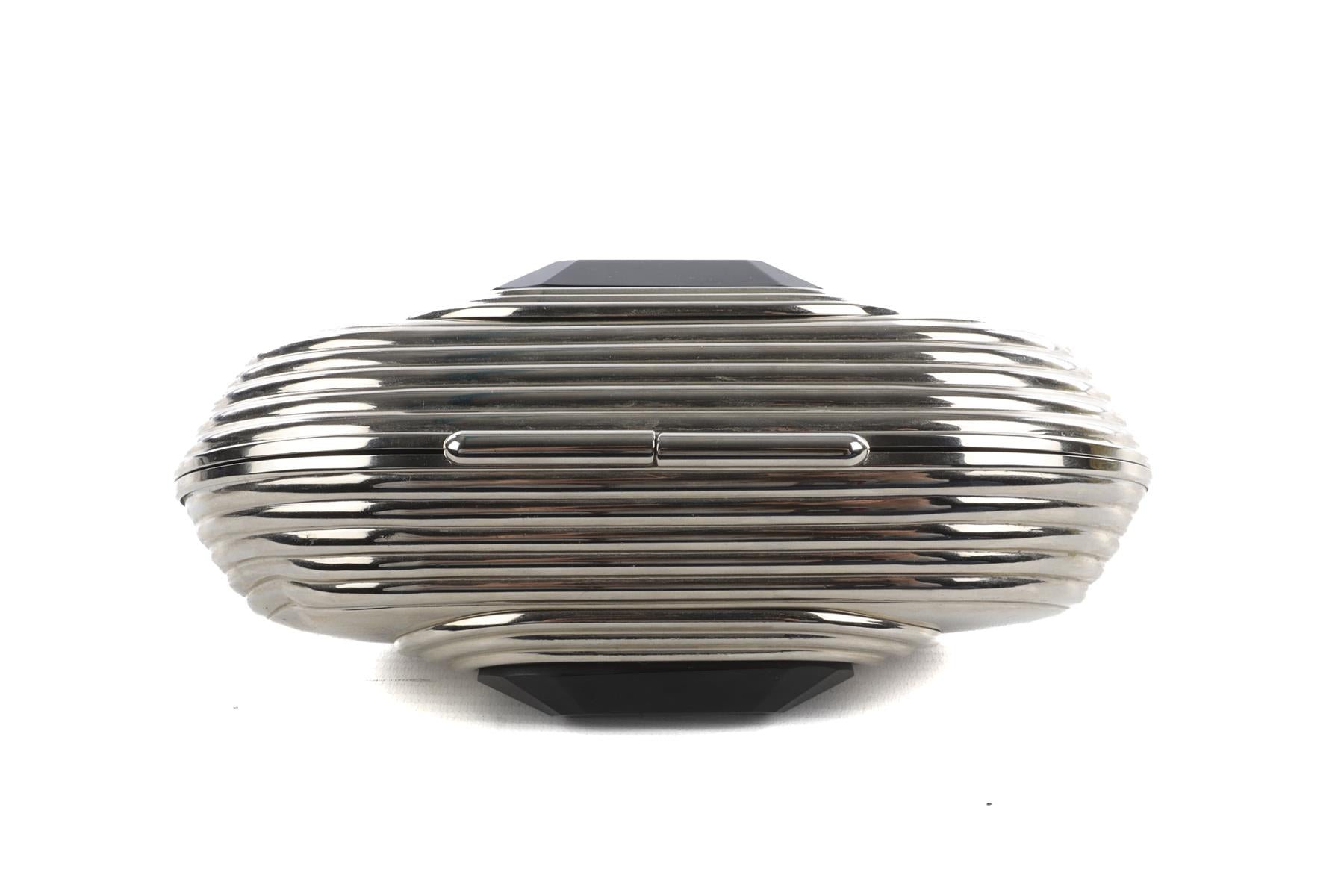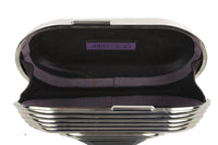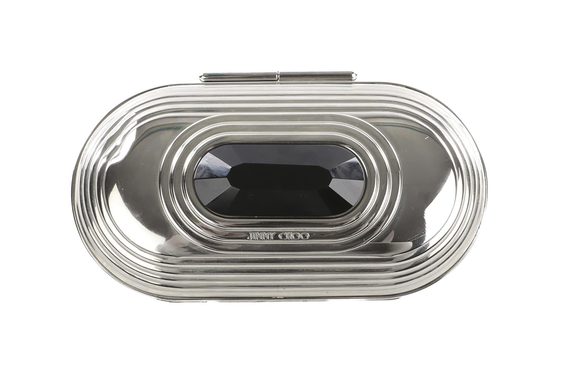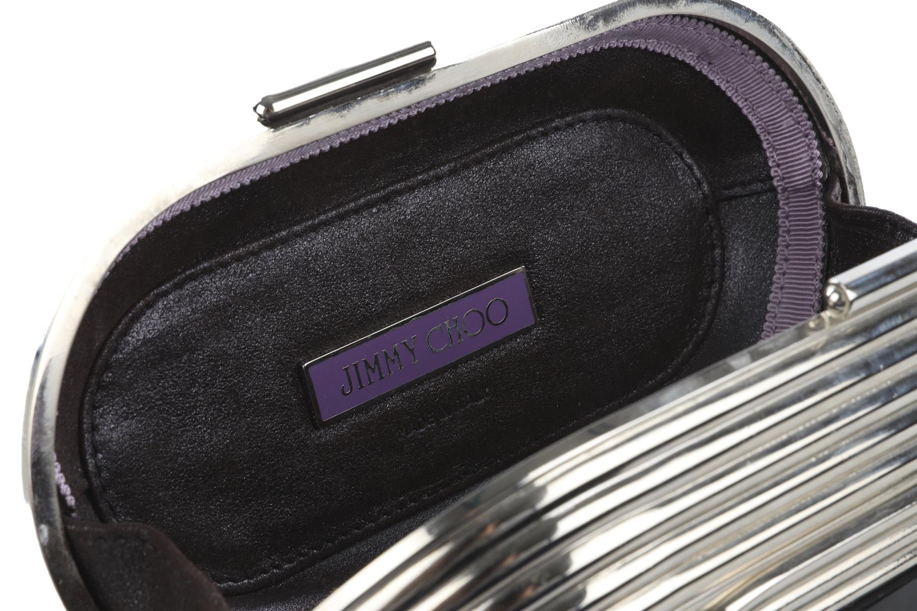 Jimmy Choo Silver Metal Clutch. SIlver and black. Push lock fastening - Top. Does not come with - dustbag or box. Height: 4 in. Width: 7 in. Depth: 2.25 in.