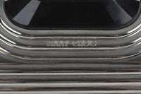 Good condition - Indentation to exterior material at front. Moderate tarnishing and scratching to hardware. Light marks to interior material; see pictures.