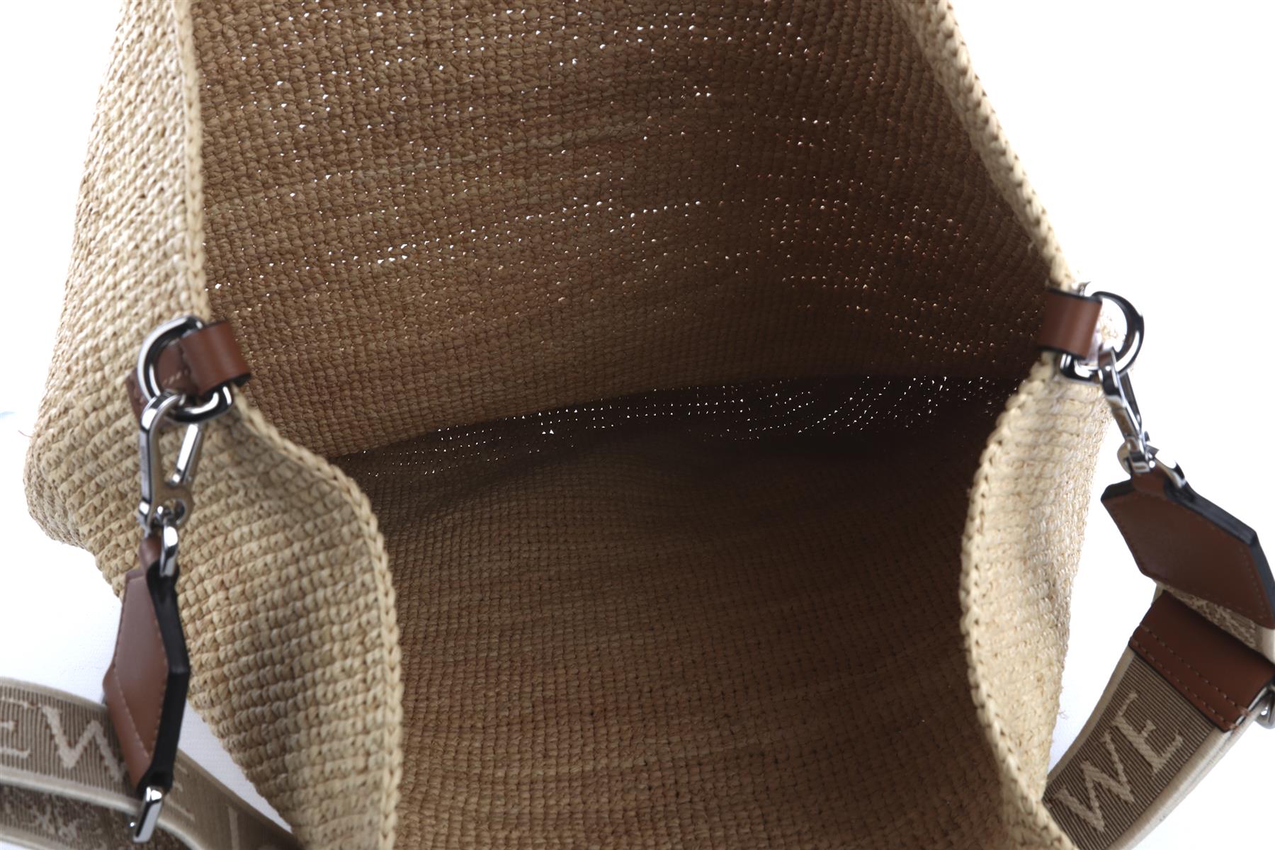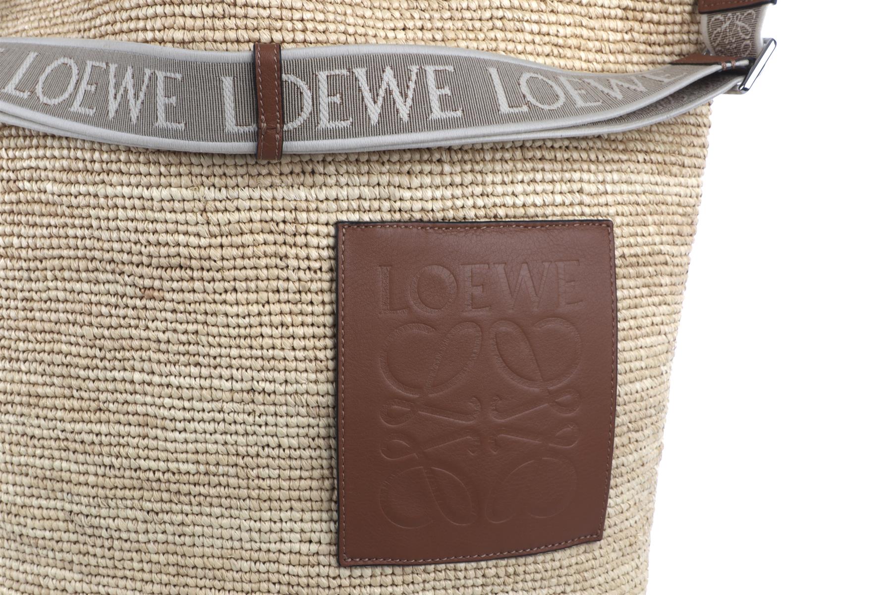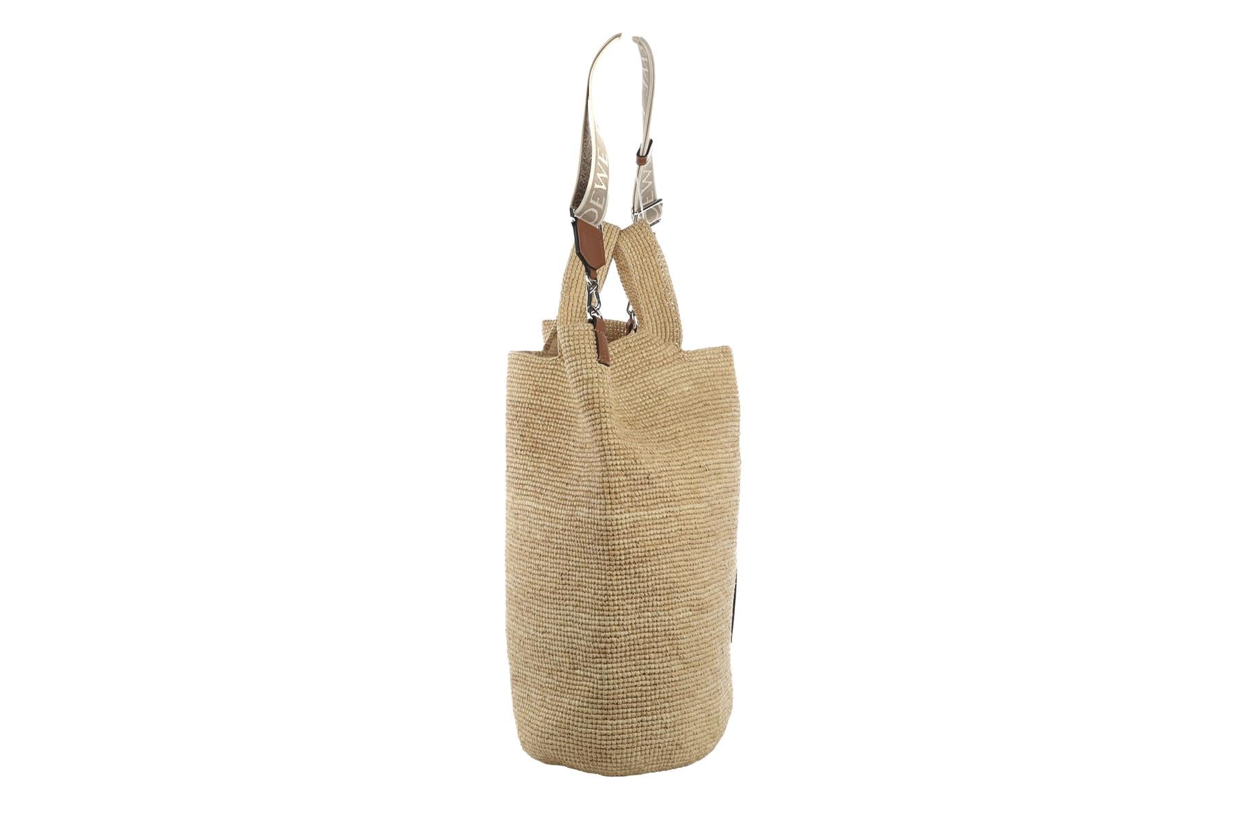 Loewe + Paula'S Ibiza Beige Slit Large Raffia Tote Bag. Beige and brown. Open Top. Does not come with - dustbag or box. Height: 17 in. Width: 19.5 in. Depth: 8 in. Handle drop: 5 in. Strap drop: 11 in.