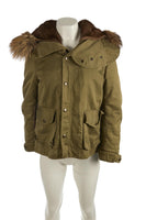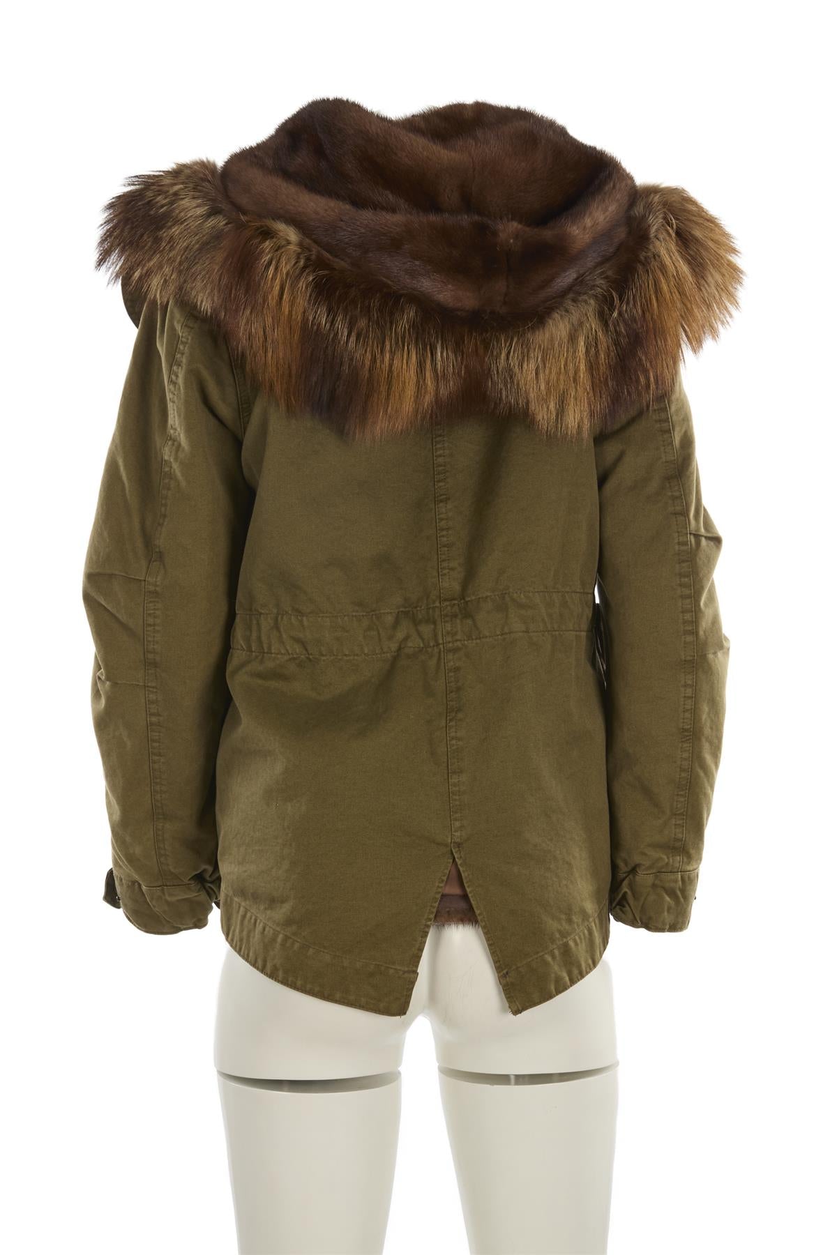 Mauro Guerresco Green Mink Fur And Cotton Jacket. Green and brown. Long Sleeve. Crewneck. Zip fastening - Front. No composition label. Medium (UK 10, US 6, FR 38, IT 42). Shoulder to Shoulder: 17 in. Bust: 38 in. Waist: 40 in. Hips: 42 in. Length: 26 in.