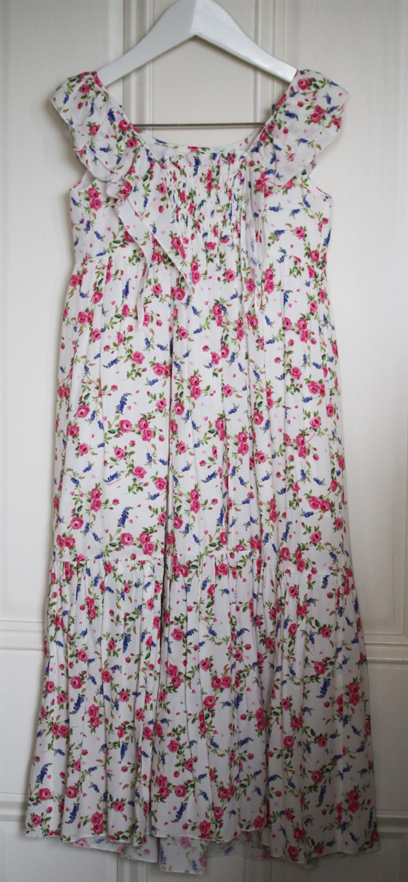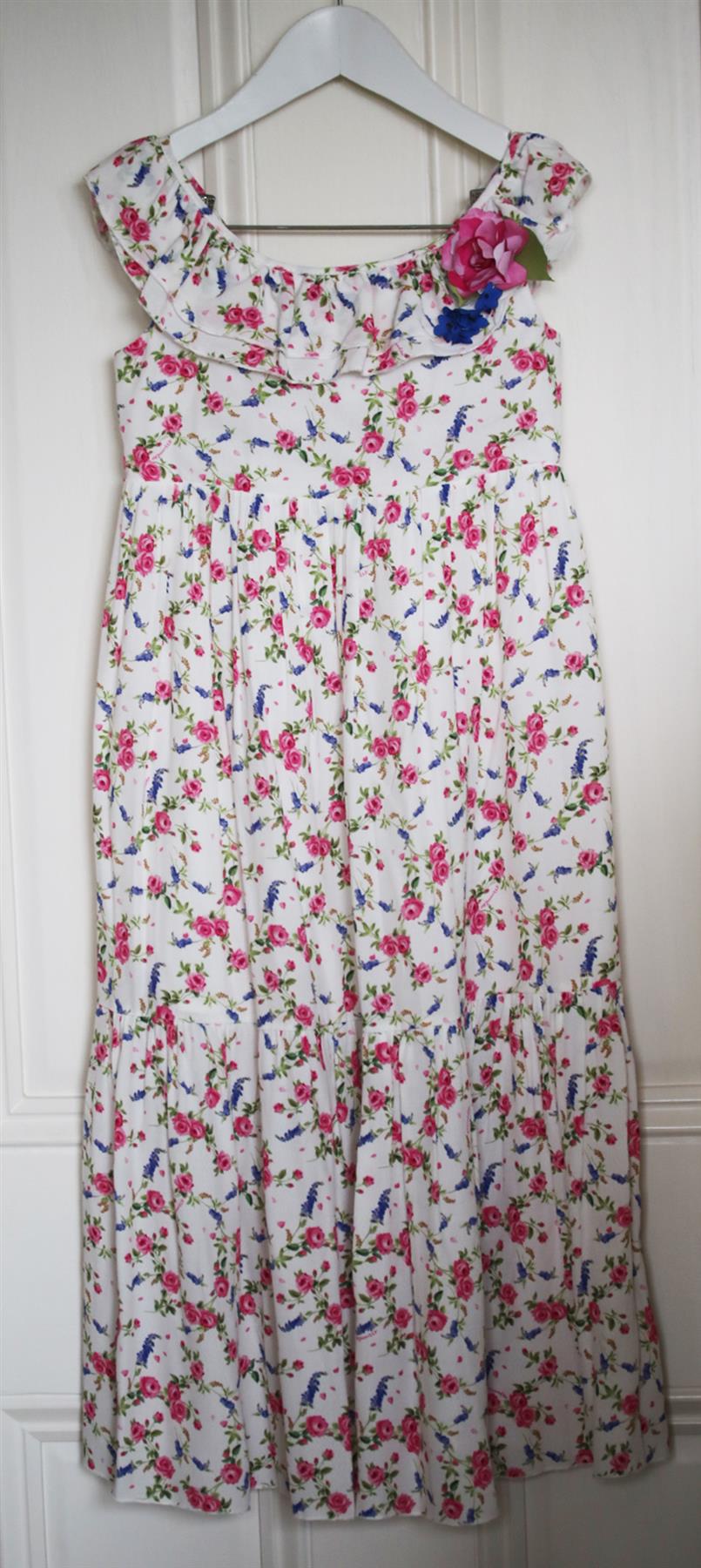 - This full length white dress has a lovely floral print, frill sleeves and is gently elasticated at the back for a perfect fit.