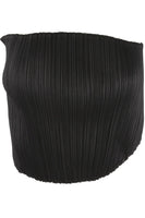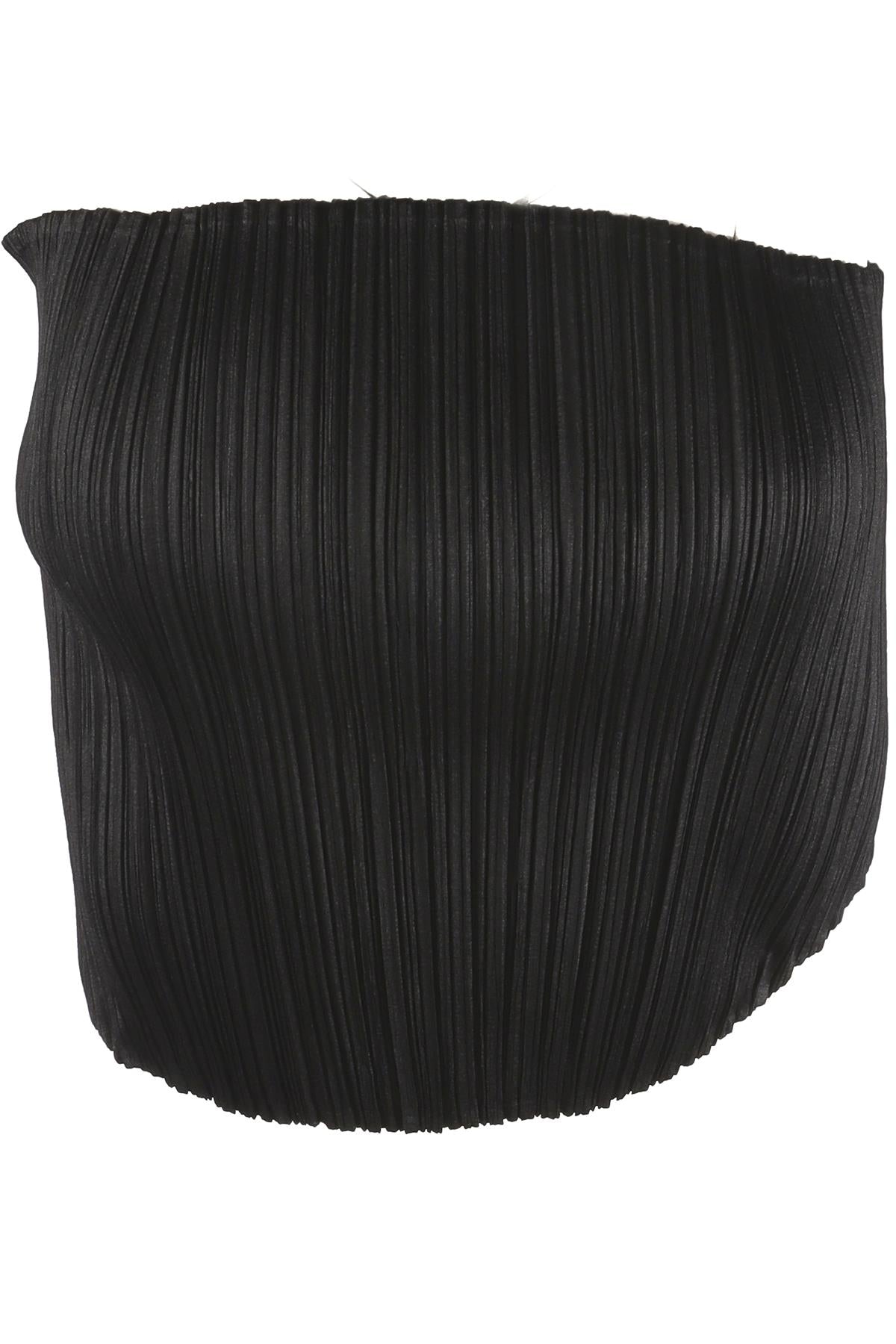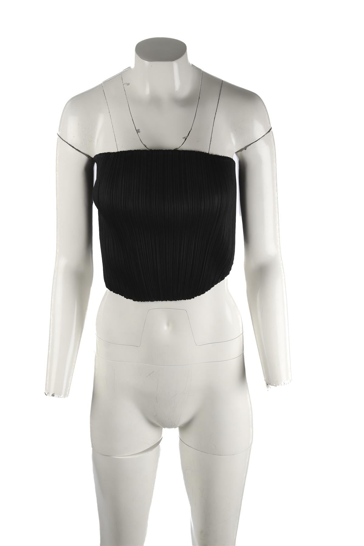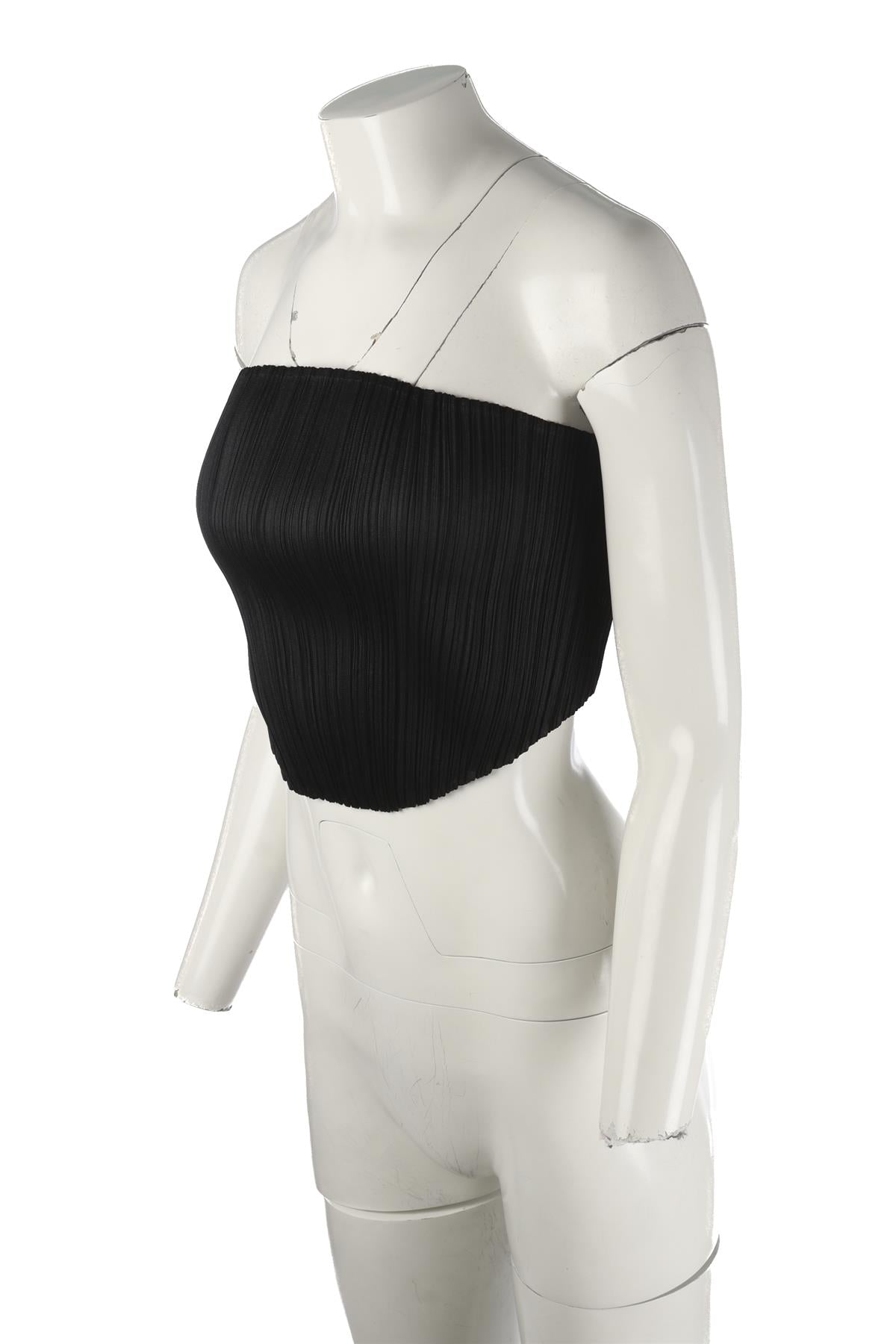 Pleats Please Issey Miyake Black Top. Black. Sleeveless. Sweetheart. Slips on. 100% Polyester. One Size. Bust: 26 in. Waist: 23 in. Hips: 24 in. Length: 12 in.