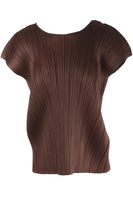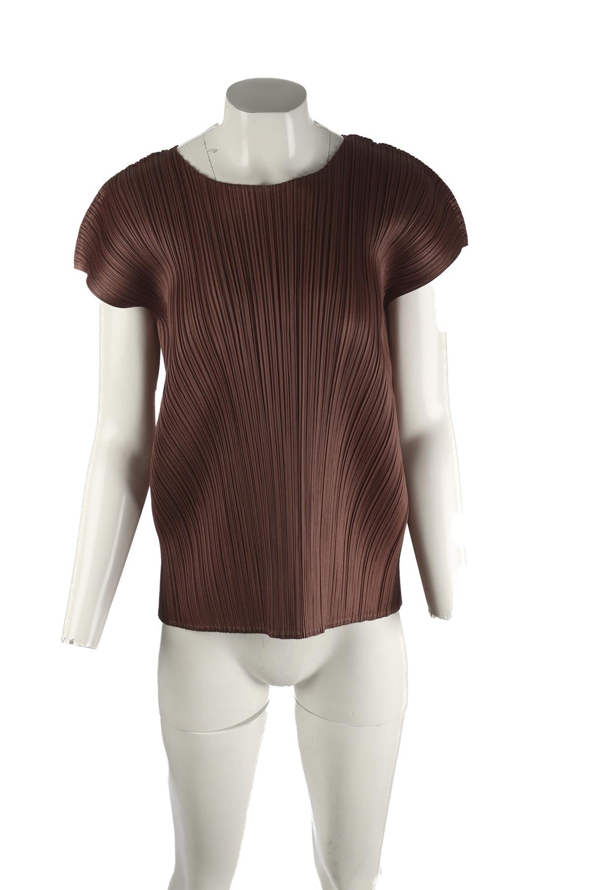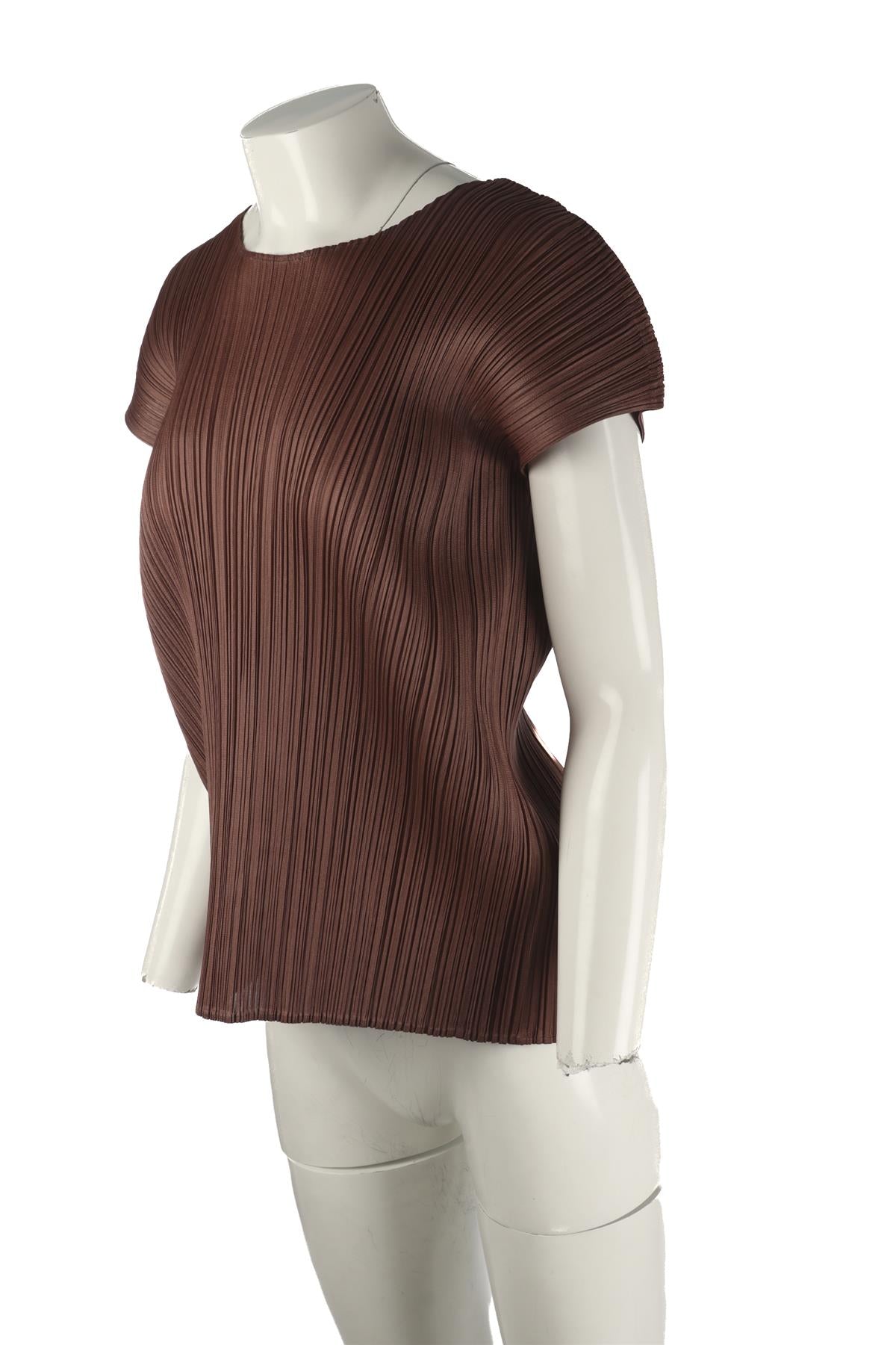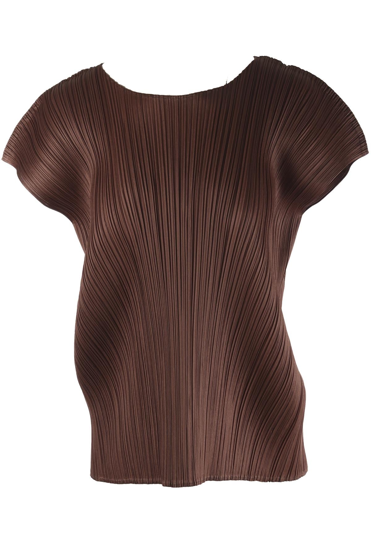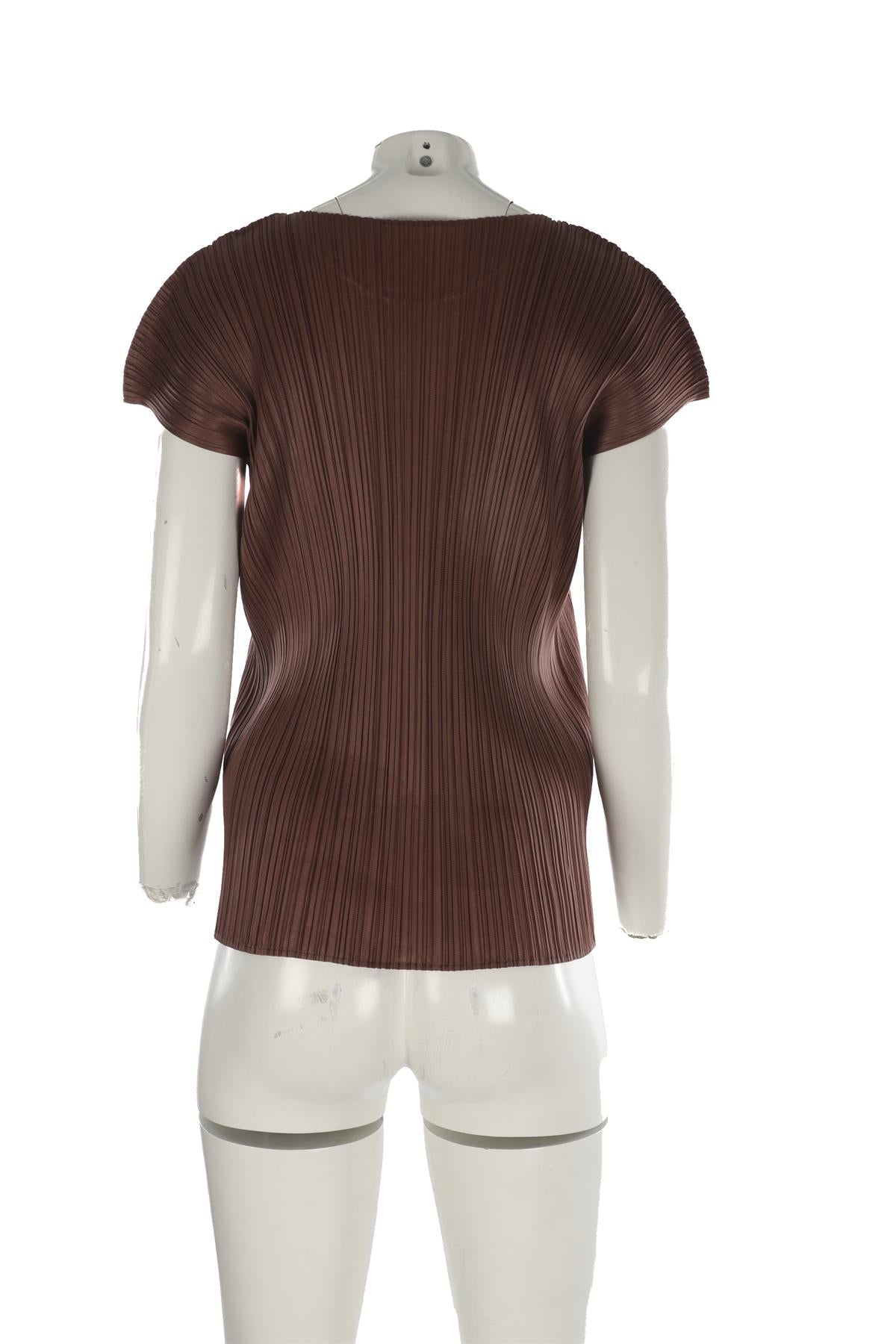 Pleats Please Issey Miyake Brown Top. Brown. Short Sleeve. Crewneck. Slips on. 100% Polyester. JP 3 (UK 8, US 4, FR 36, IT 40). Bust: 31 in. Waist: 30 in. Hips: 30 in. Length: 23 in.