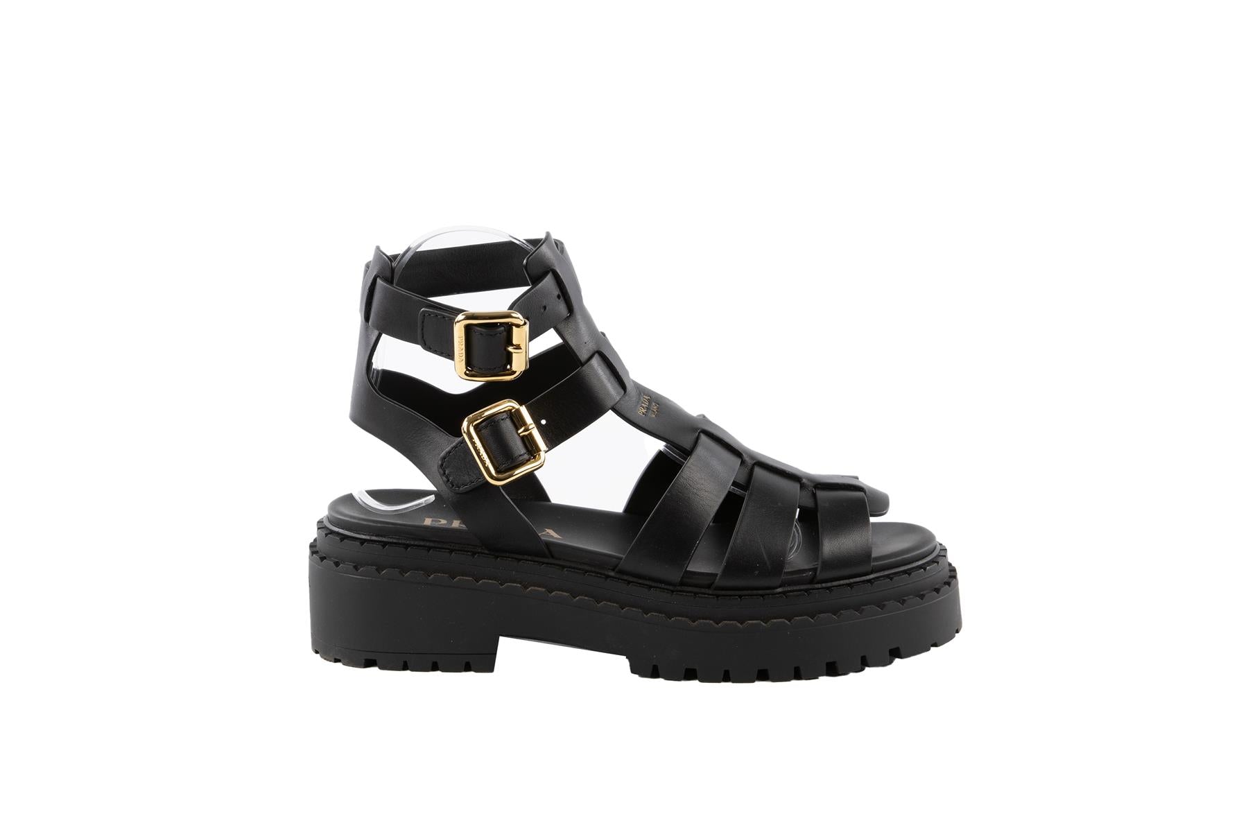 Prada Black Leather Platform Sandals. Black. Buckle fastening - Side. Does not come with - dustbag or box. EU 38 (UK 5, US 8). Insole: 10 in. Heel Height: 2.5 in.