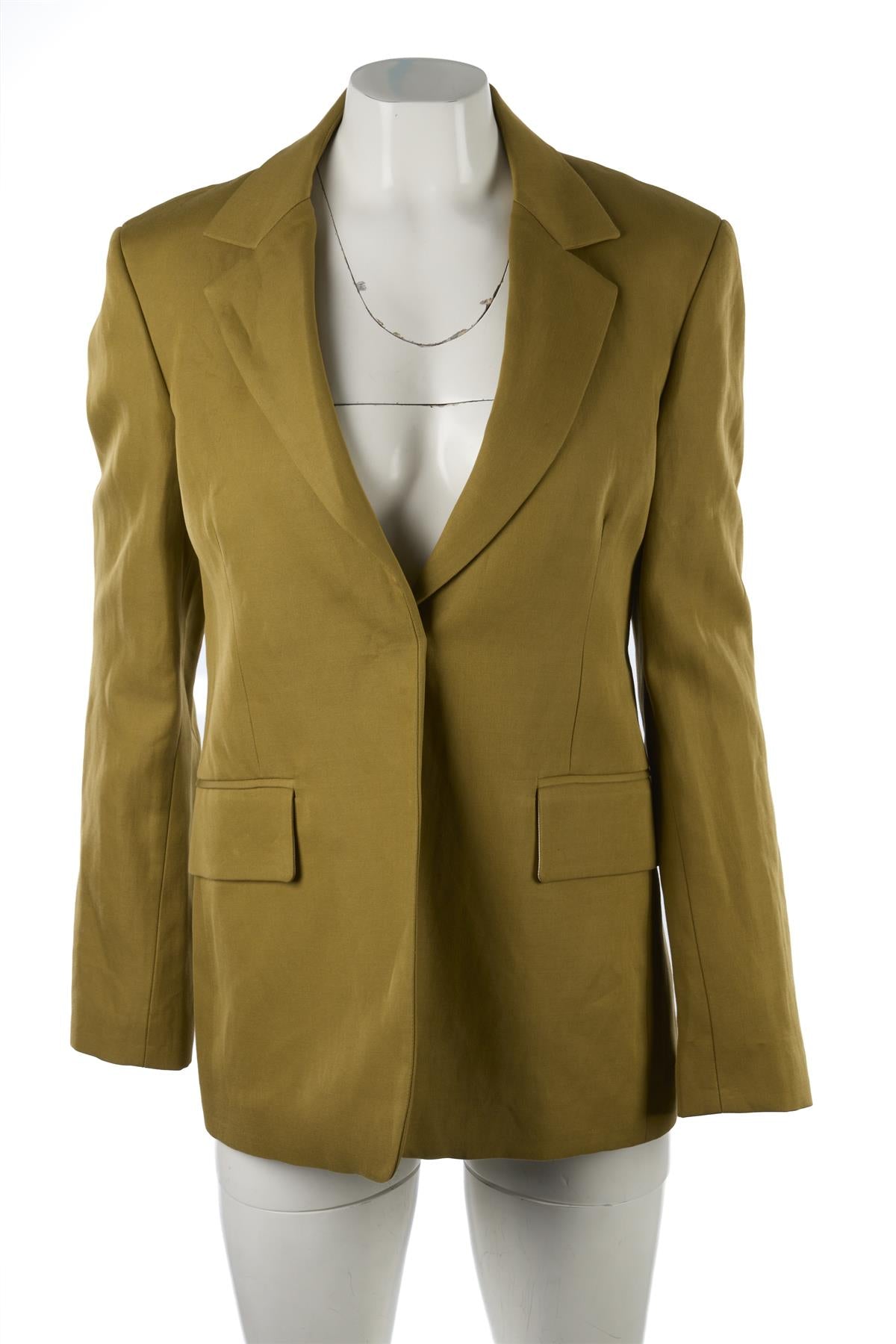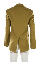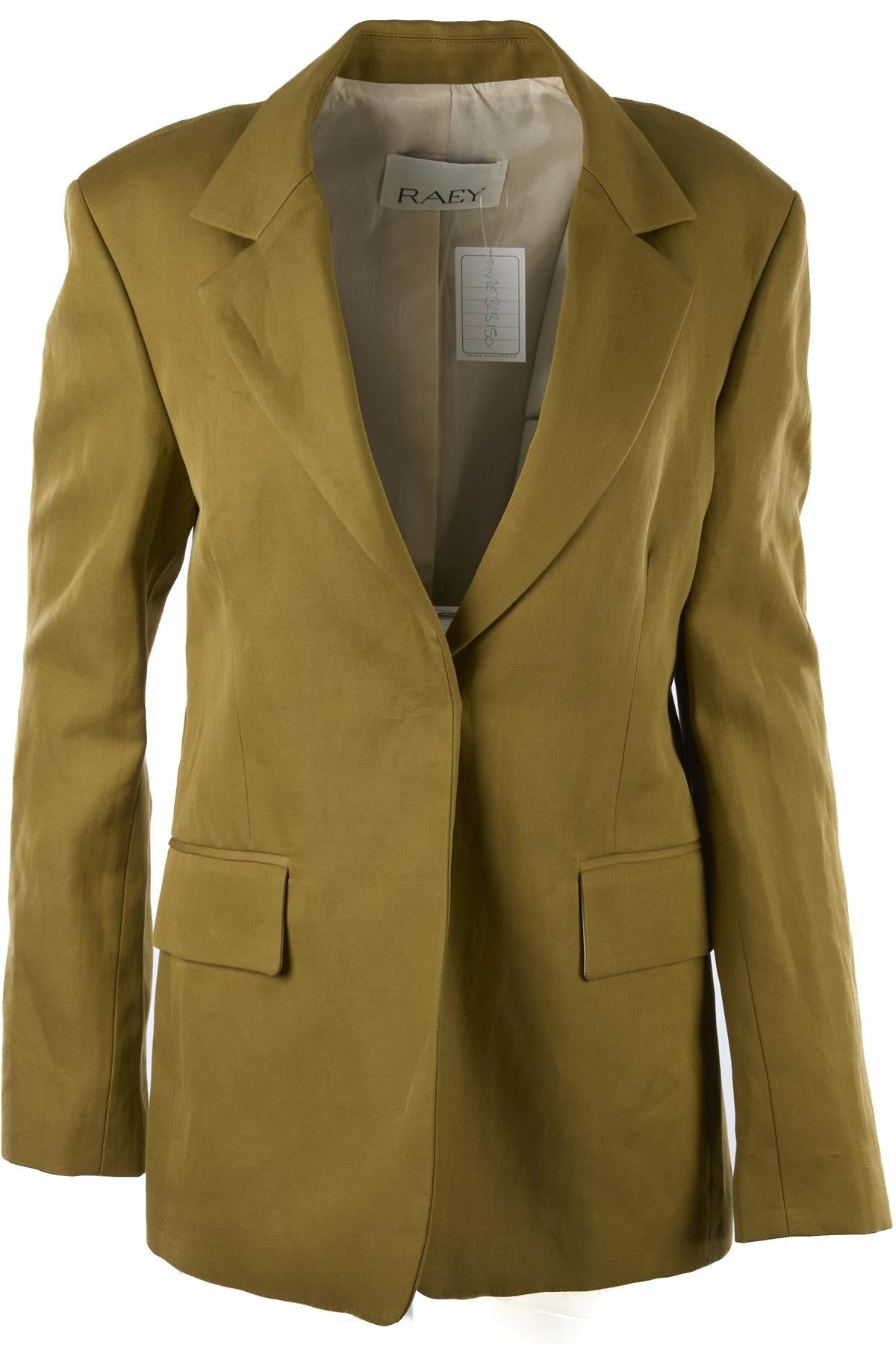 Raey Green Cotton Blazer. Green. Long Sleeve. V-Neck. Button fastening - Front. 57% Ramie, 43% Cotton, 51% Viscose, 49% Cotton. UK 4 (US 0, FR 32, IT 36). Shoulder to Shoulder: 17 in. Bust: 37 in. Waist: 35 in. Hips: 36 in. Length: 29.5 in.