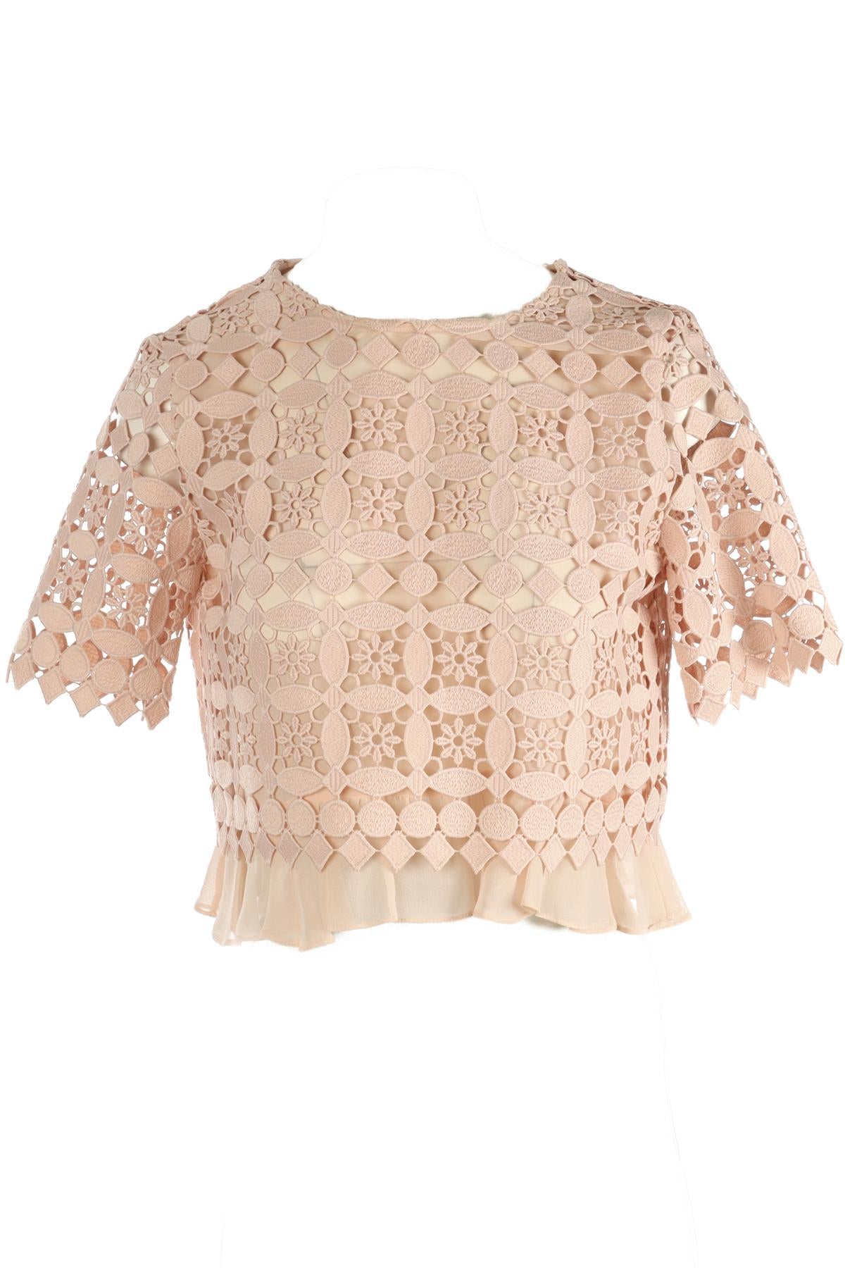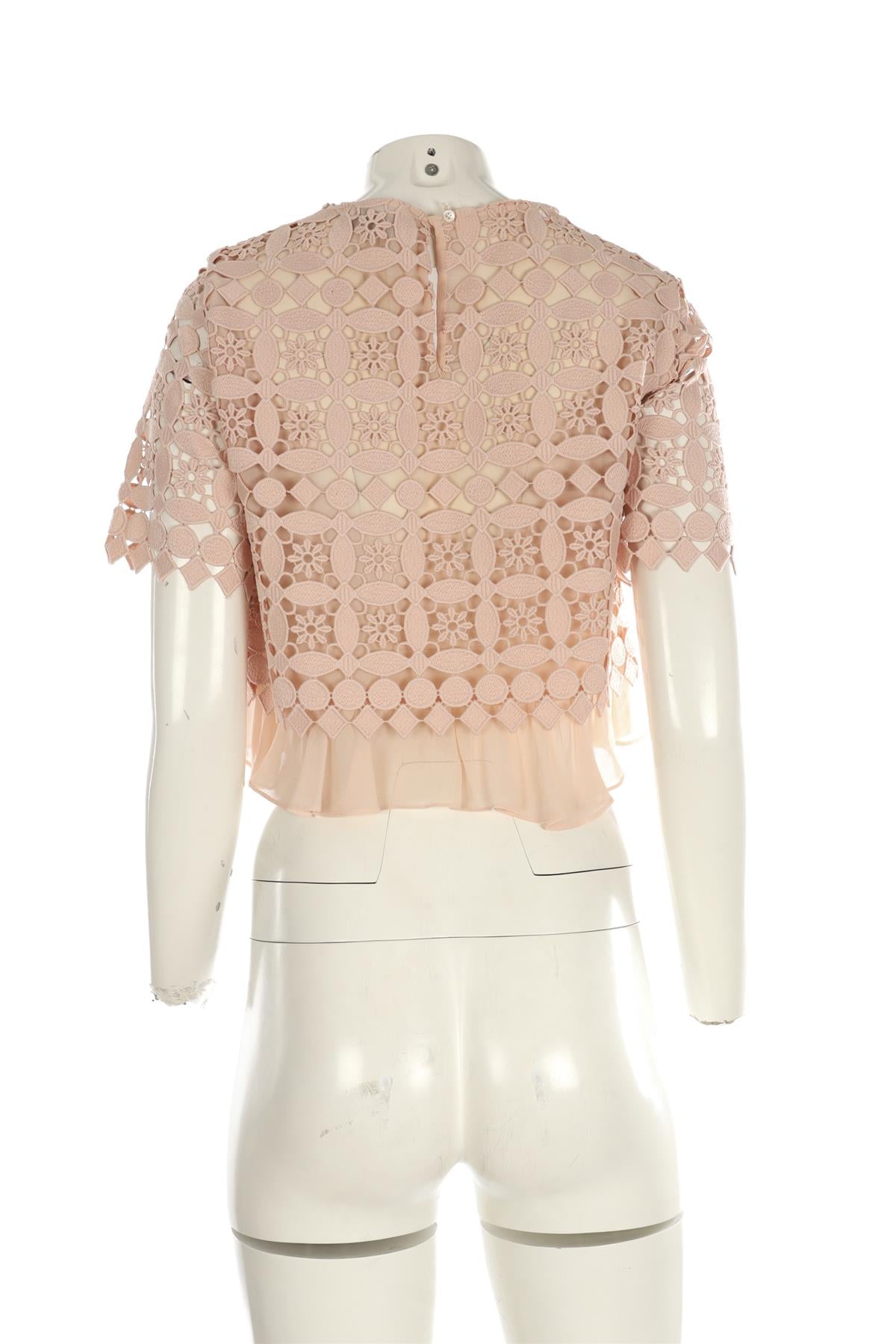 Sandro Pink Crochet Top. Pink. Short Sleeve. Crewneck. Button fastening - Back. 100% Polyester. FR 36 (UK 8, US 4, IT 40). Bust: 36 in. Waist: 36 in. Hips: 36 in. Length: 17.5 in.