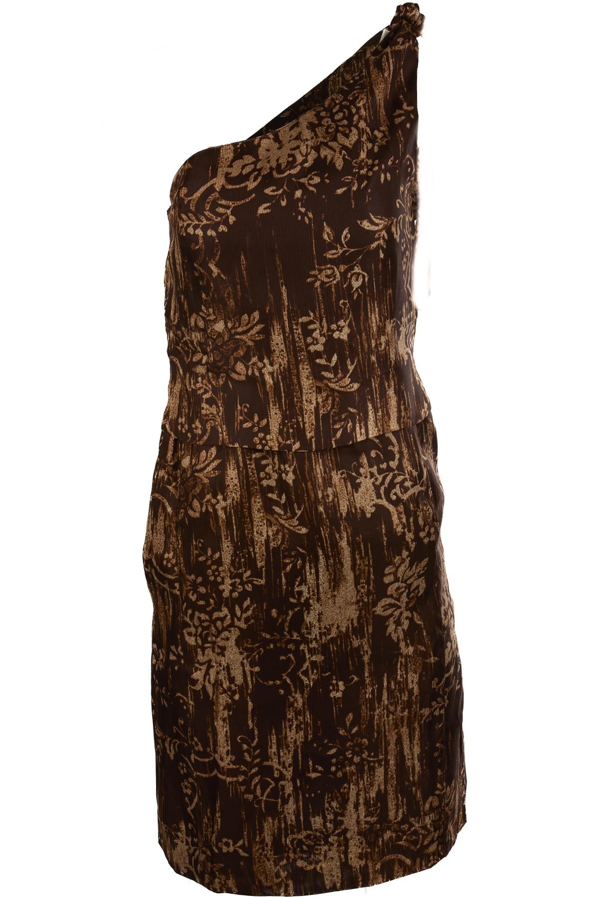 Oscar De La Renta Brown 2009 Silk Mini Dress. Brown. Sleeveless. Asymmetric. Zip fastening - Side. 100% Silk. US 6 (UK 10, FR 38, IT 42). Bust: 30 in. Waist: 28 in. Hips: 34 in. Length: 34 in.