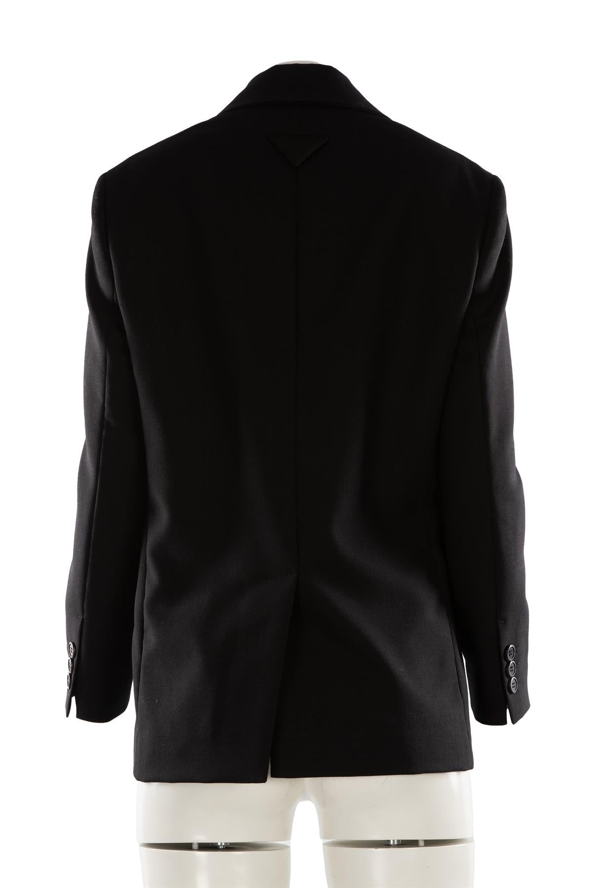 Prada Black Wool Blazer. Black. Long Sleeve. V-Neck. Button fastening - Front. 100% Virgin wool, 100% Viscose. IT 38 (UK 6, US 2, FR 34). Bust: 40 in. Waist: 39 in. Hips: 43 in. Length: 28.5 in.