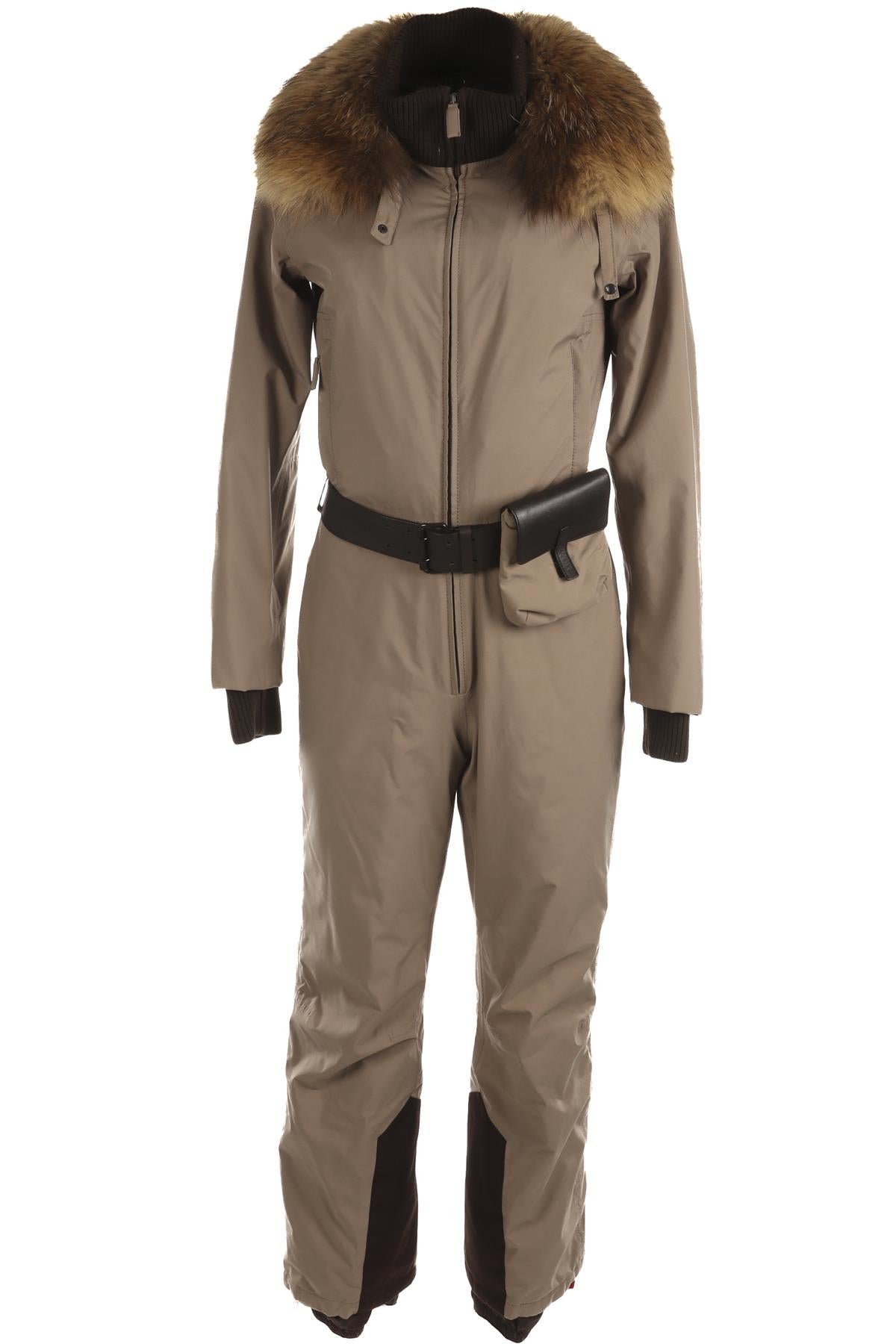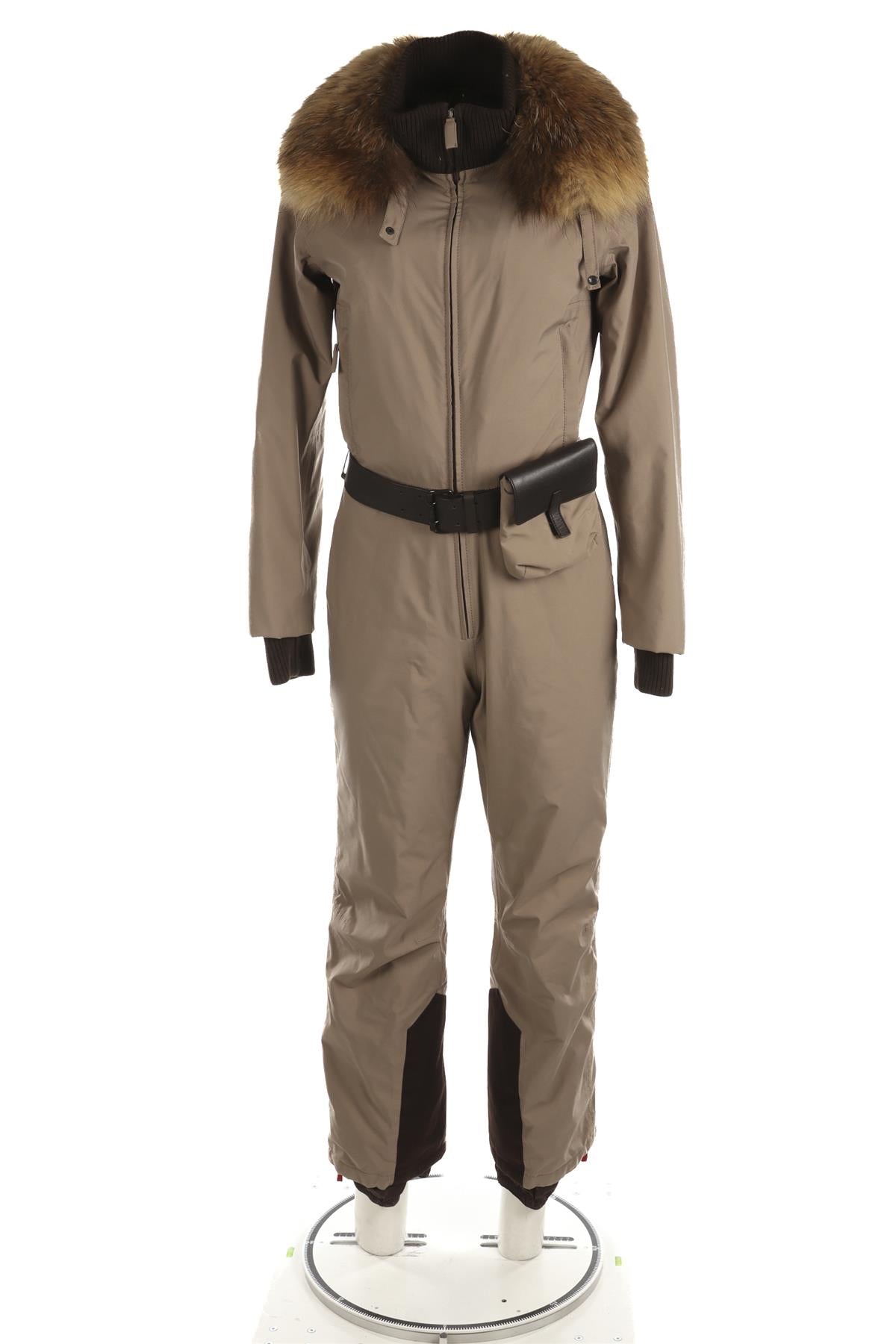 Prada Taupe Linea Rossa Padded Shell Ski Suit. Taupe. Long Sleeve. Crewneck. Zip fastening - Front. 100% Polyester, 100% Nylon, 100% Wool. IT 42 (UK 10, US 6, FR 38). Waist: 34 in. Hips: 28 in. Length: 37 in. Inseam: 58 in. Rise: 30 in.